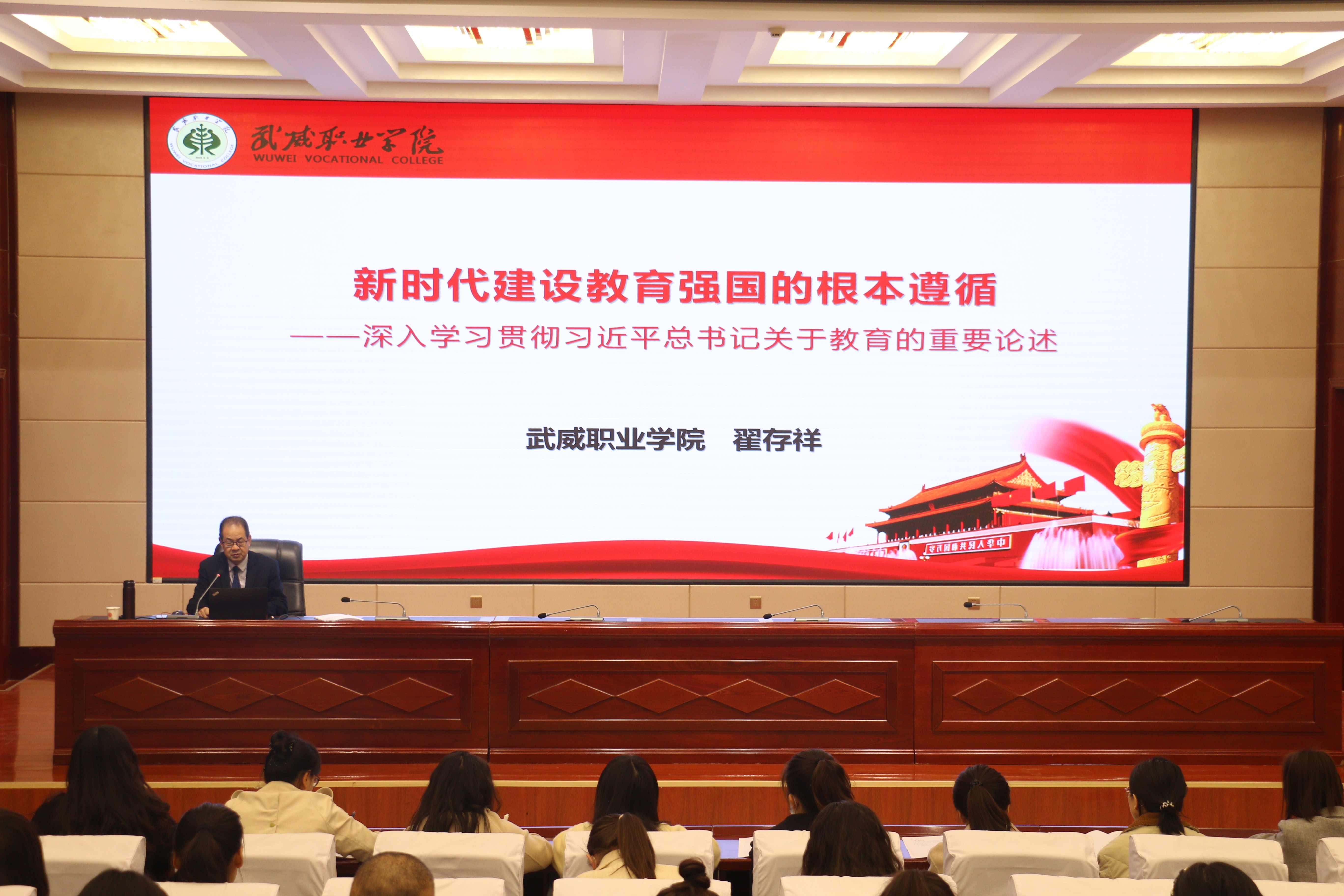 翟存祥代表全體師生對113名新教師成為武威職業(yè)學(xué)院大家庭的一員表示熱烈歡迎,并介紹了舉辦此次培訓(xùn)班的目的。他指出,百年大計,教育為本;教育大計,教師為本;教師大計,師德為本。作為新時代的教師,不要辜負(fù)習(xí)近平總書記“奮斗創(chuàng)造奇跡、力量源于團(tuán)結(jié)、希望寄予青年”的殷切希望。同時,他要求新教師要搞清楚“我是誰,從哪里來,到哪里去”;搞清楚我要“干什么、如何干、為誰干”。盡快站穩(wěn)三尺講臺,盡快融入職業(yè)教育,盡快融入這個大家庭,盡快成長為一名合格的、優(yōu)秀的人民教師,在教育教學(xué)崗位上立德立功立言。