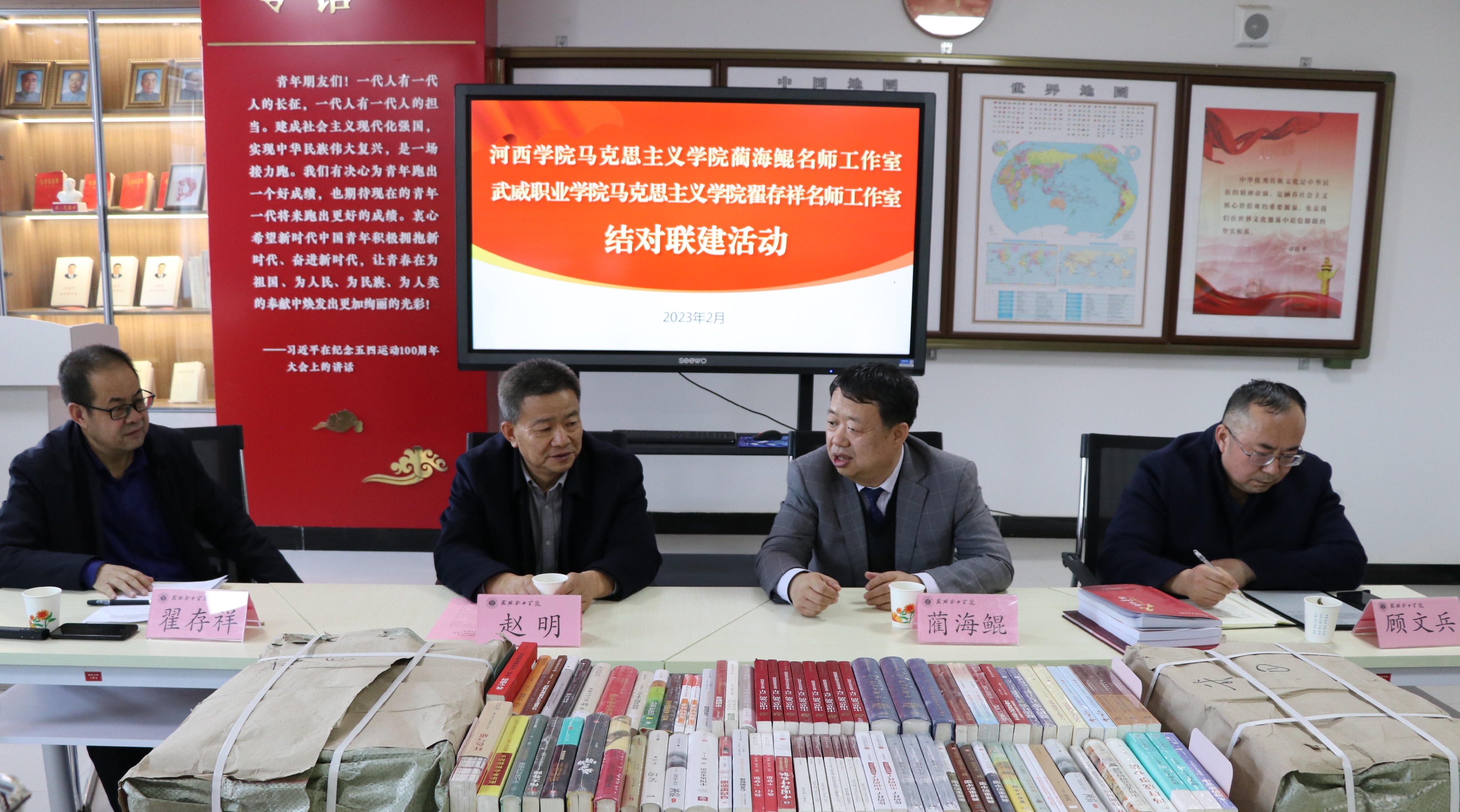 藺海鯤教授和翟存祥教授代表各自工作室簽訂了結對聯(lián)建協(xié)議,藺海鯤名師工作室為翟存祥名師工作室贈送了思政教育類書籍。雙方共同表示,將在未來的工作室建設及其它思政教育教學工作中互學互鑒、共促發(fā)展。
