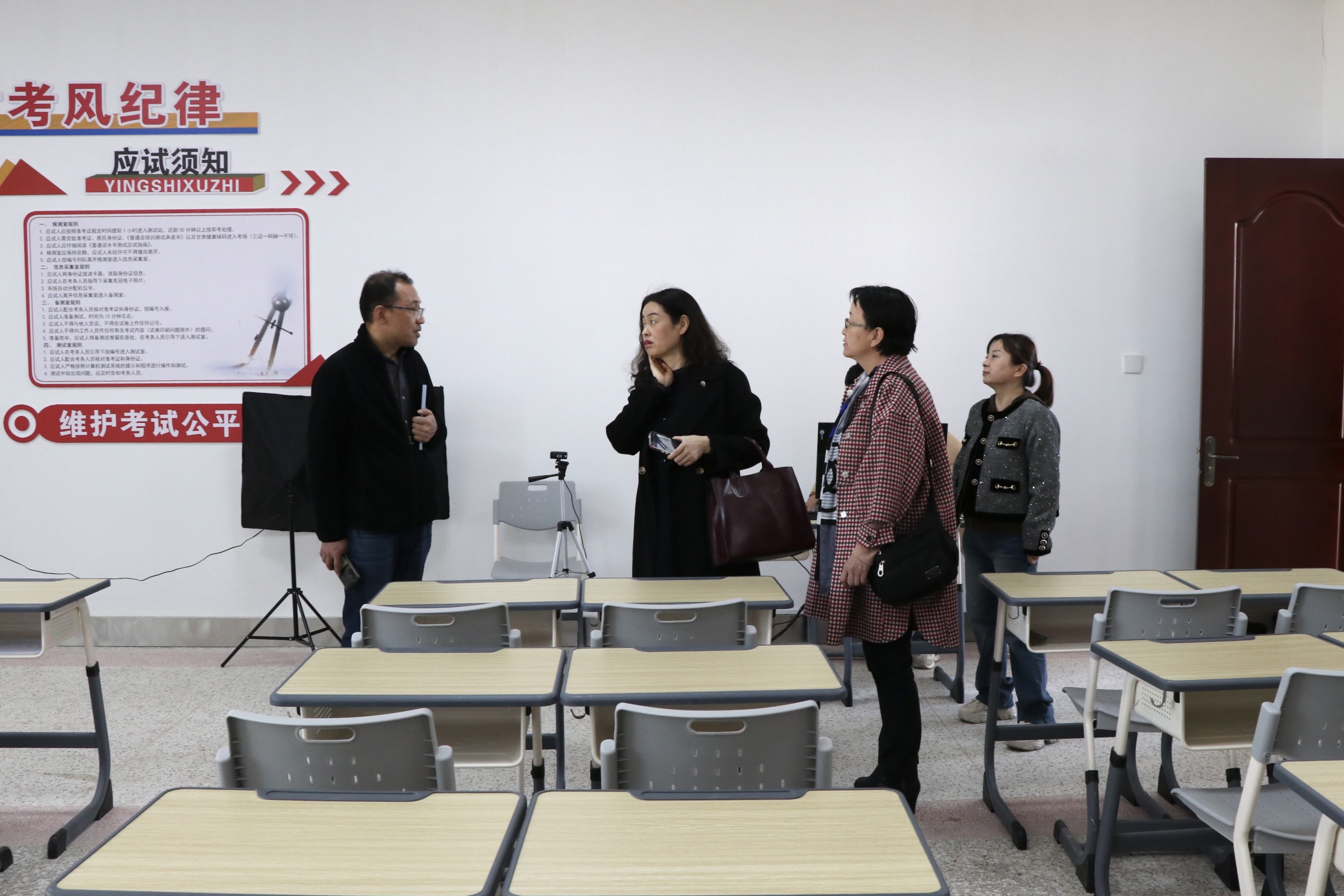 評估驗收組采取實地查看、聽取匯報、座談交流等方式對我校測試站的標準化建設工作進行了檢查。新建的普通話標準化測試機房配備20個機位,空間場地充足,面積規(guī)模較大;同時建成了候測室、信息采集室,布局科學合理,設備配置齊全;制作了語言文字宣傳欄、“推普”展板、標志牌、指引牌等,為普通話測試營造了良好的考試環(huán)境。