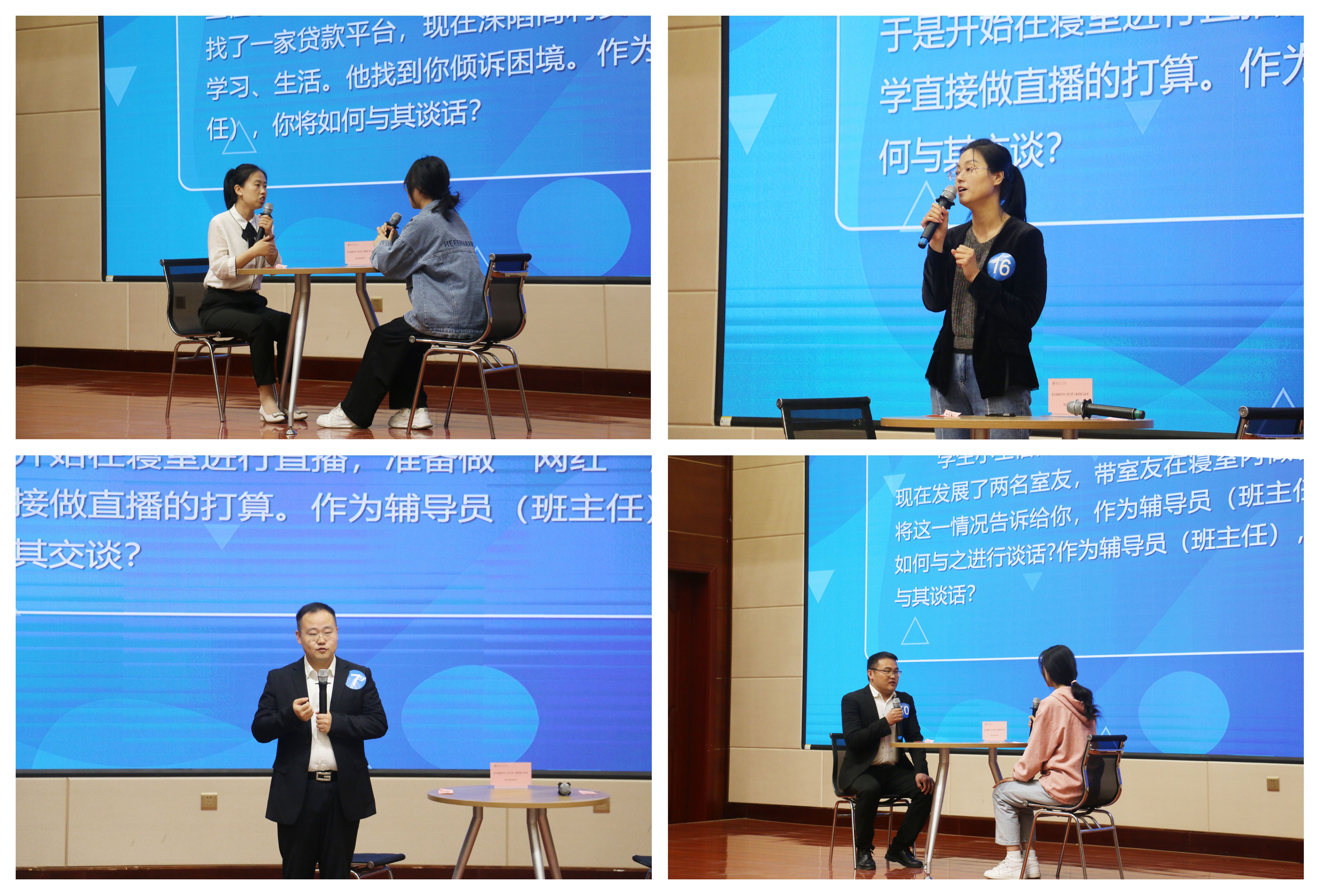 4月20日,談心談話環(huán)節(jié)在菁英廳進行。比賽中,面對“問題百變”的參演學生,參賽選手從學生特征、學生成長、成才規(guī)律等方面進行了耐心、細致的談心談話,充分展示了輔導員、班主任對學生的教育引導、解決思想困惑和處理實際問題的能力。