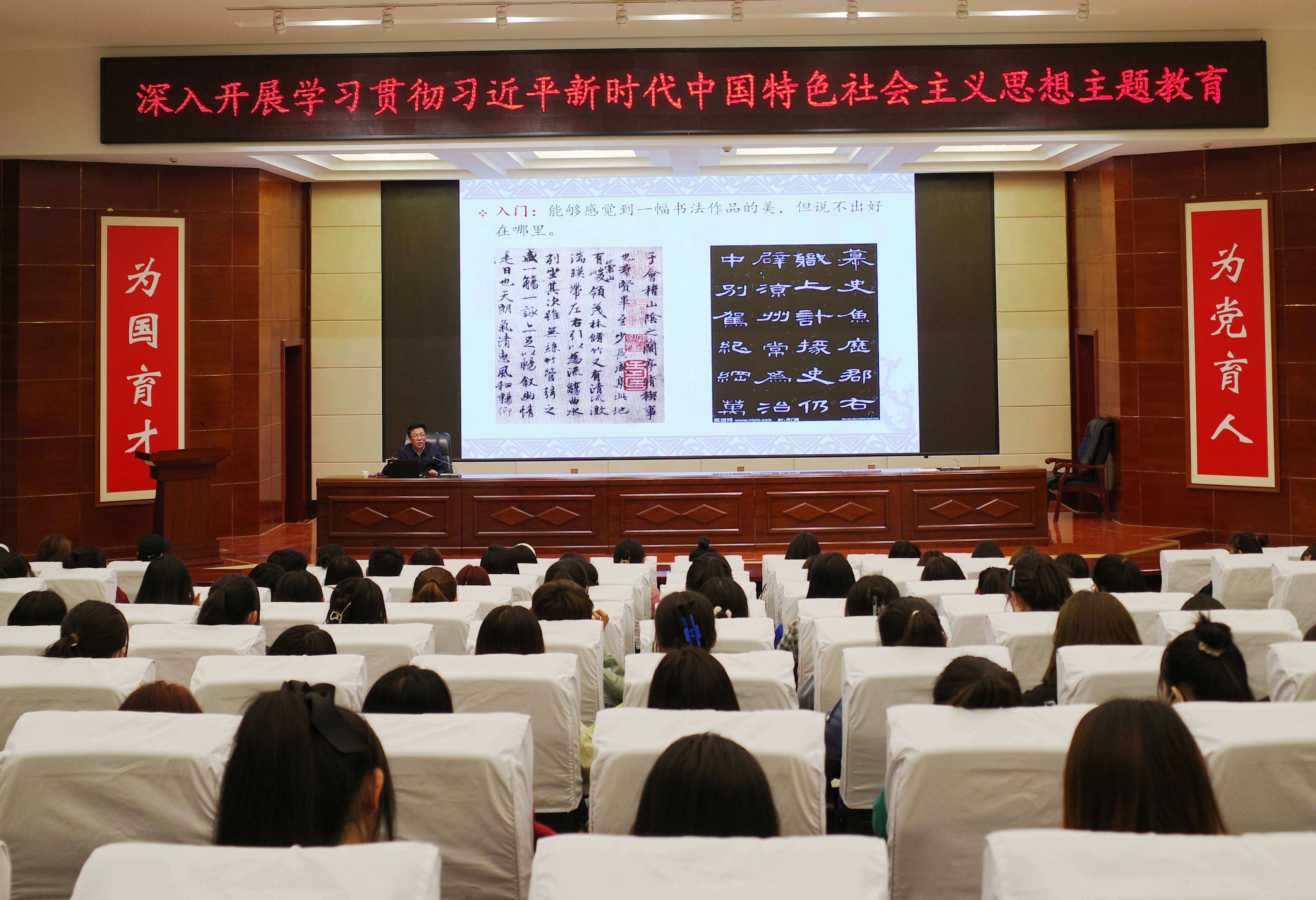 活動(dòng)中,齊澤山在菁英廳為師生做了題為“如何欣賞書法作品”專題講座,他介紹了中國(guó)書法藝術(shù)的起源、傳統(tǒng)、特點(diǎn),以《蘭亭序》《曹全碑》等多幅經(jīng)典書法作品為例,深入解析了書法藝術(shù)的魅力與內(nèi)涵,清晰呈現(xiàn)了中國(guó)書法悠久的歷史脈絡(luò),使師生們對(duì)中國(guó)書法藝術(shù)的起源與發(fā)展有了更加深刻地理解。講座引經(jīng)據(jù)典、風(fēng)趣幽默、親切自然,讓師生在輕松愉悅的氛圍中升華了對(duì)書法藝術(shù)的審美感受。師生們紛紛表示,此次講座是一次難得的學(xué)習(xí)機(jī)會(huì),受益匪淺,對(duì)中國(guó)書法藝術(shù)有了更深入、更全面的了解。