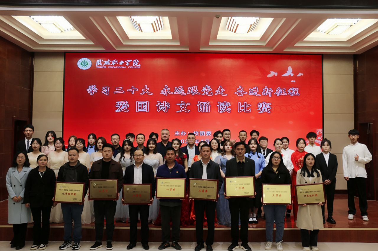 大賽于3月啟動,歷時一個月,各二級學(xué)院經(jīng)過初賽評比推選出9個優(yōu)秀節(jié)目入圍決賽。比賽現(xiàn)場,各參賽隊以“學(xué)習(xí)二十大、永遠跟黨走、奮進新征程”為主題,將傳承經(jīng)典詩文和弘揚愛國主義精神結(jié)合,誦詩抒情、借詞言志,熱情謳歌中國共產(chǎn)黨不懈奮斗的光輝歷程,全面展現(xiàn)新時代青年以夢為馬,不負韶華的青春風(fēng)貌。校團委原創(chuàng)編排表演的節(jié)目《追夢八步沙,奮斗正青春》,深情動人,感染全場,歌頌了“六老漢”矢志艱苦奮斗的隴人品格,抒發(fā)了當(dāng)代青年永跟黨走,青春建功的豪情壯志。富余藝術(shù)感染力的經(jīng)典吟誦,穿插舞蹈、劇情和紅歌演唱,為廣大師生呈現(xiàn)了一場視聽盛宴。