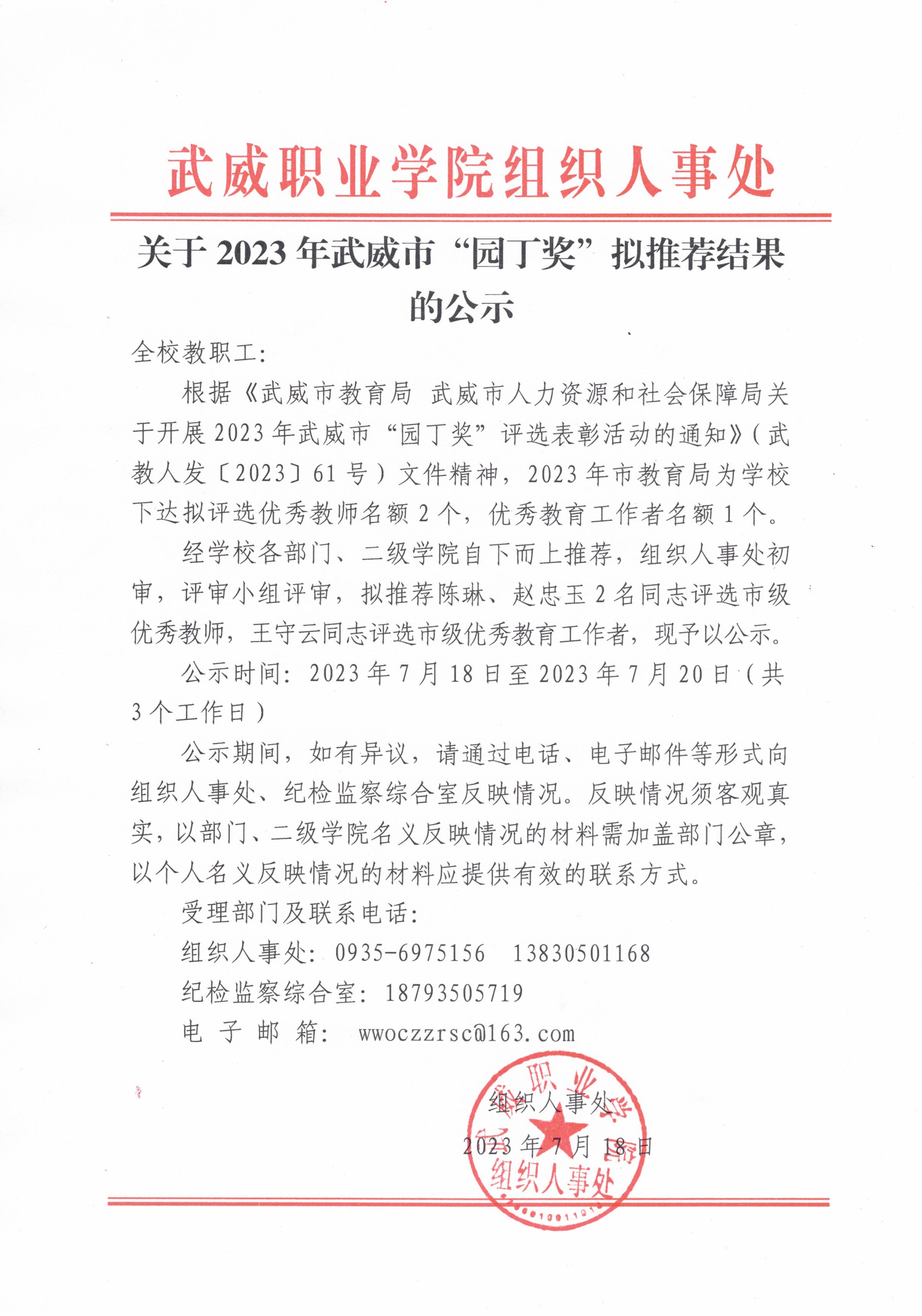 關(guān)于2023年武威市“園丁獎(jiǎng)”擬推薦結(jié)果的公示