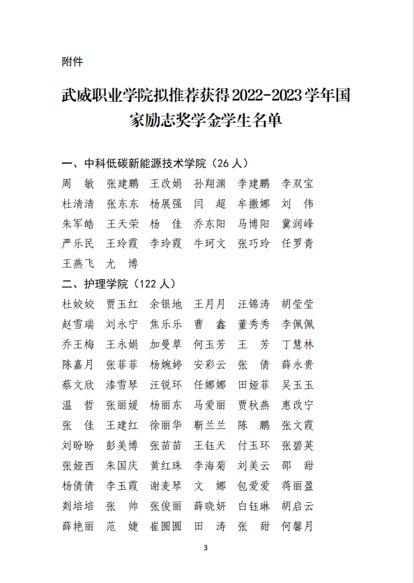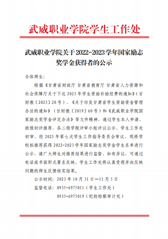 武威職業(yè)學(xué)院關(guān)于2022-2023學(xué)年國家勵志獎學(xué)金候選人的公示