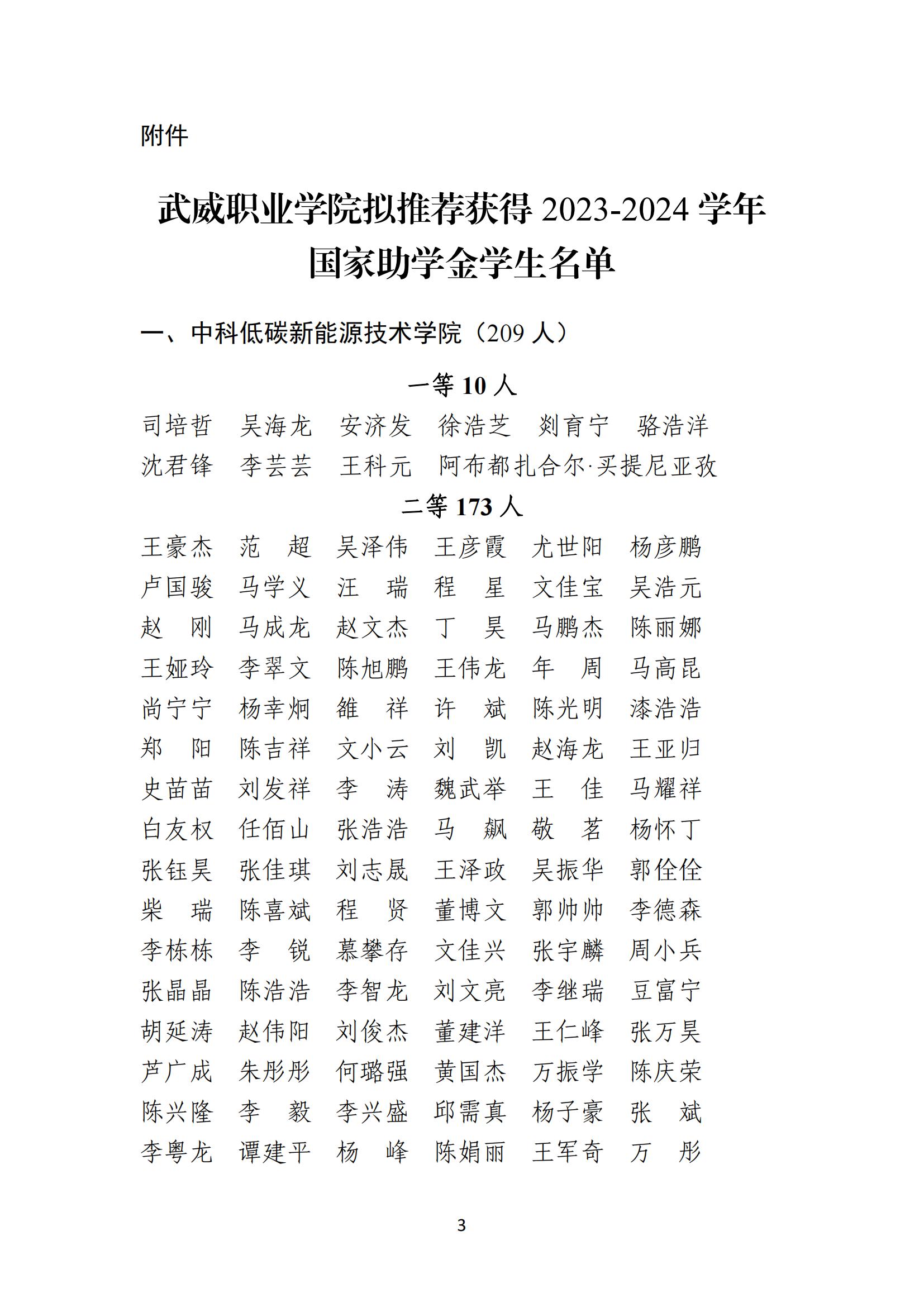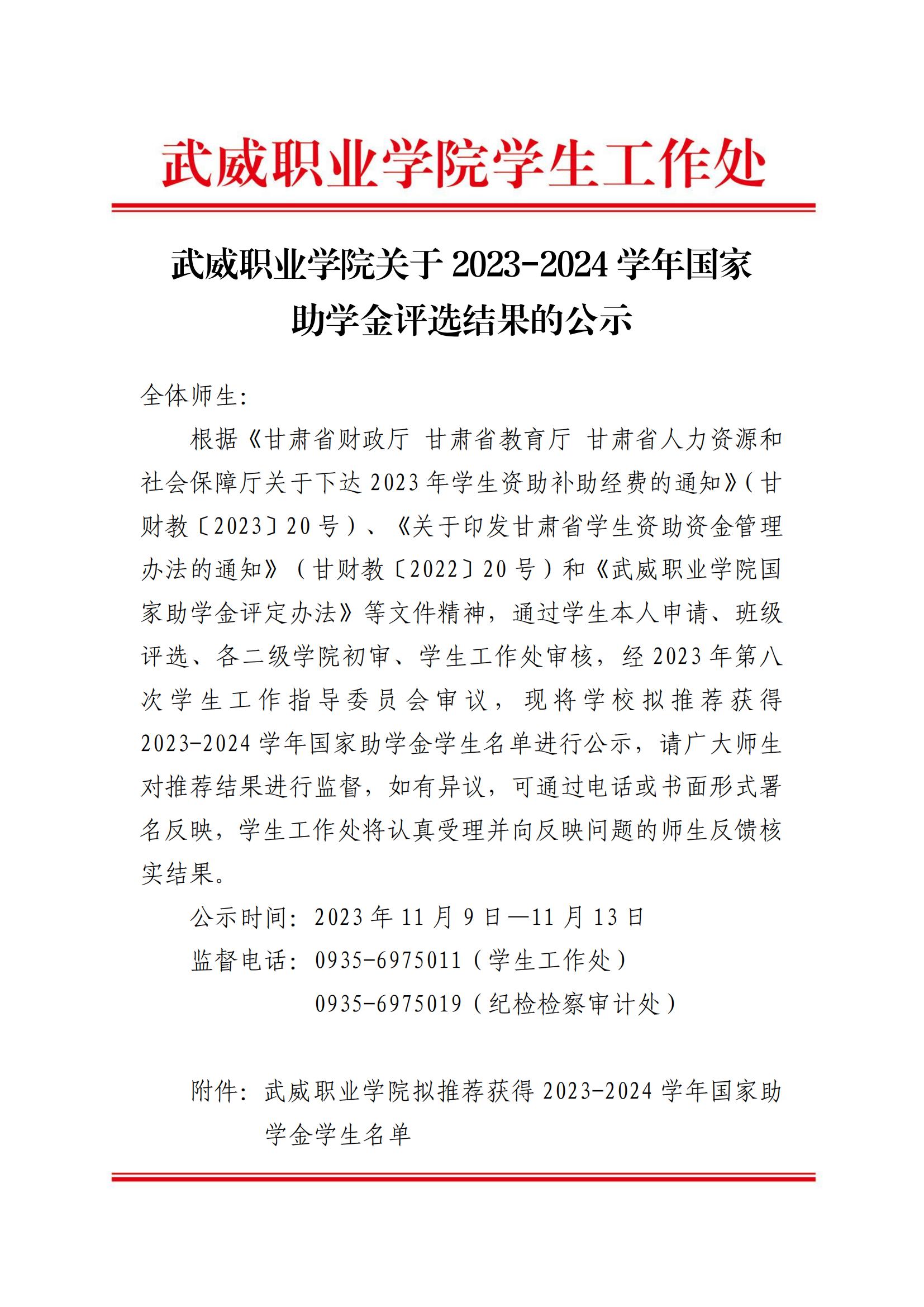 武威職業(yè)學院關于2023-2024學年國家助學金評選結果的公示