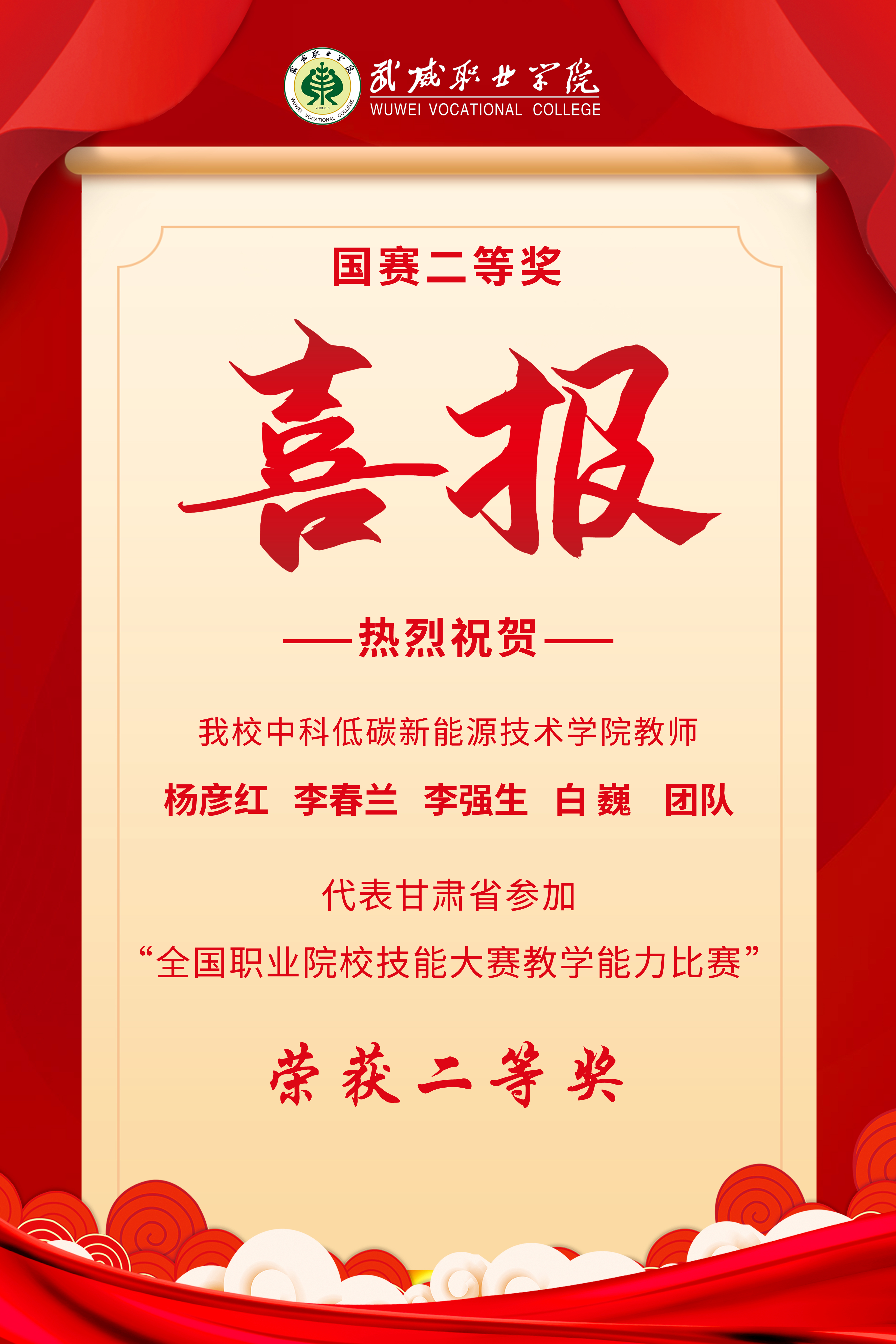 11月23-25日,2023年全國職業(yè)院校技能大賽教學能力比賽決賽在江西現(xiàn)代職業(yè)技術學院舉行,由我校中科低碳新能源學院教師楊彥紅、李強生、李春蘭、白巍組成的參賽團隊代表甘肅省參加比賽,喜獲二等獎。