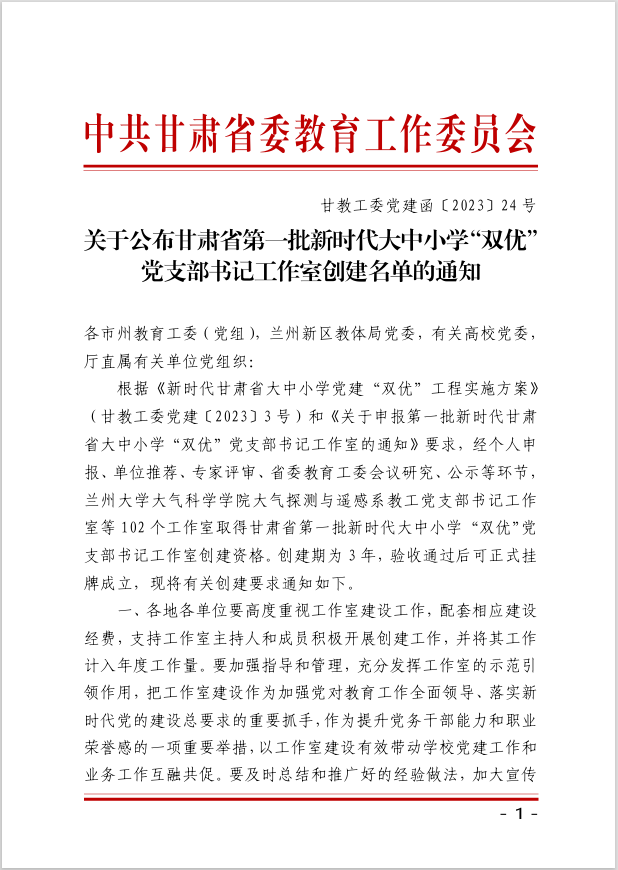 近日,中共甘肅省委教育工作委員會(huì)公布了《關(guān)于公布甘肅省第一批新時(shí)代大中小學(xué)“雙優(yōu)”黨支部書記工作室創(chuàng)建名單的通知》(甘教工委黨建函〔2023〕24號(hào)),全省高校32個(gè)黨支部書記工作室獲批創(chuàng)建資格,中科低碳新能源技術(shù)學(xué)院教師黨支部書記工作室(支部書記黃述杰教授)成功入選,獲得創(chuàng)建資格。