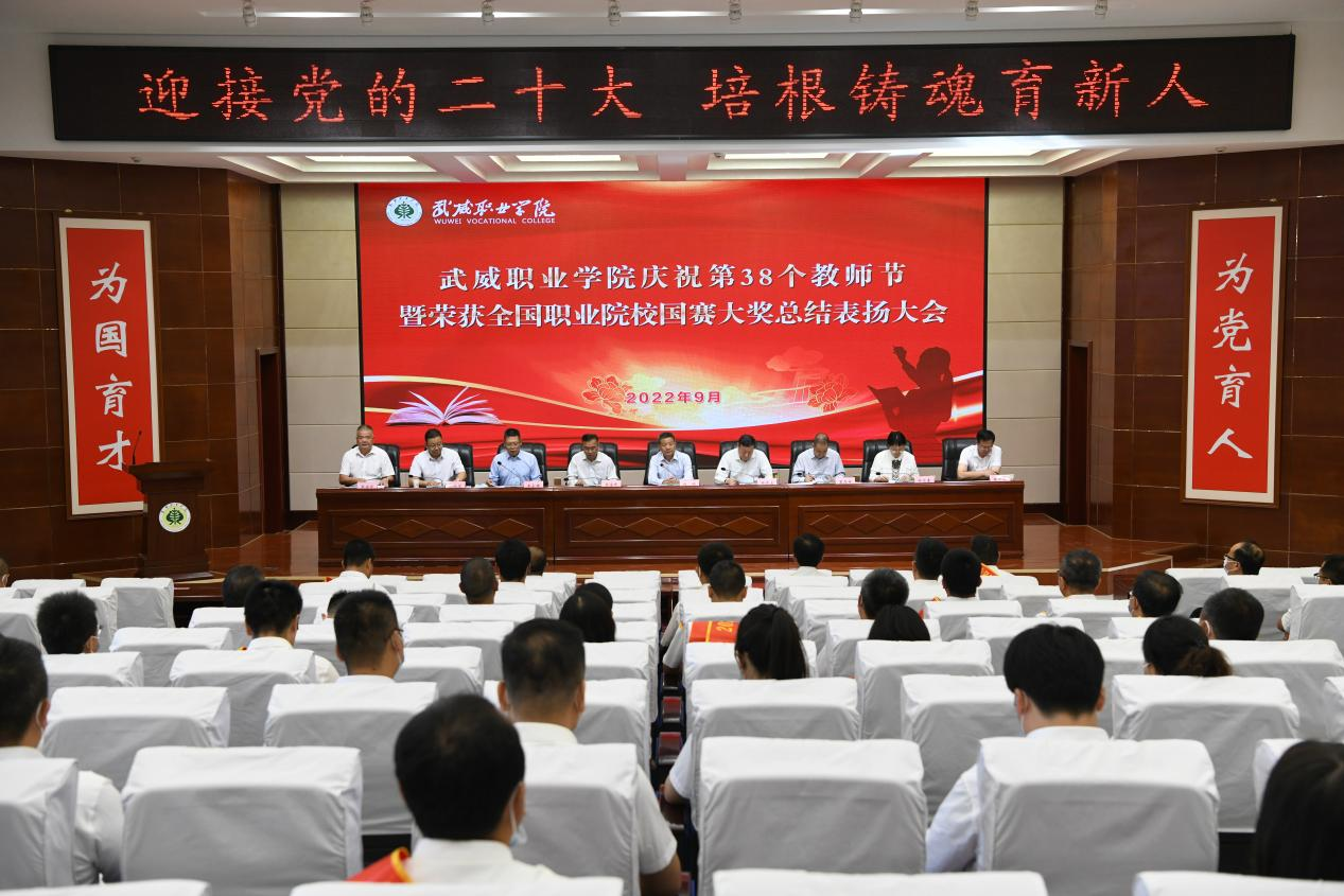 9月7日,學校慶祝第38個教師節(jié)暨榮獲全國職業(yè)院校國賽大獎總結表揚大會在菁英廳隆重舉行。中科院先進核能創(chuàng)新研究院高級技術顧問、教育顧問,原華東理工大學副校長、武威職業(yè)學院中科低碳新能源技術學院院長、教授楊存忠,武威市教育局黨組成員、副局長李海峰,學校領導班子成員出席會議,中層以上干部、受表揚教師及學生代表參加會議。大會由黨委書記、校長趙明主持。