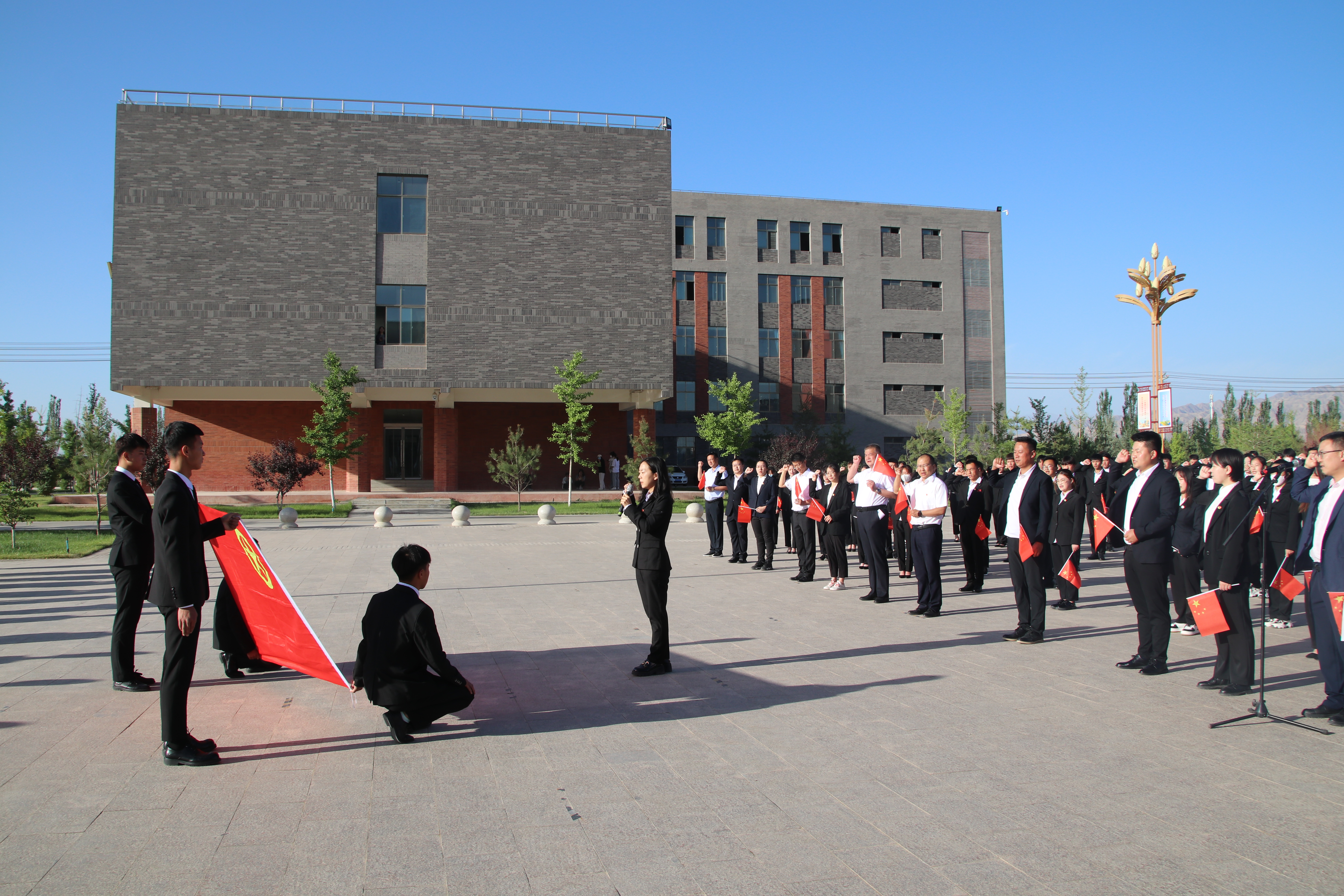 迎著朝陽,五星紅旗在國旗護衛(wèi)隊的護送下緩緩入場,昂昂國歌奏響,國旗迎風(fēng)飄揚,全場師生齊唱國歌。學(xué)生代表在國旗下致獻詞,對黨許下青春的誓言,獻詞之后舉行了嚴(yán)肅莊重的重溫入團誓詞儀式,增強了共青團員的組織光榮感和歸屬感,激發(fā)了團員青年的使命感和責(zé)任感。最后,全體團員青年齊唱《共青團團歌》,用響亮的歌聲表達建團百年再出發(fā)的祝福,現(xiàn)場愛國熱情持續(xù)高漲。