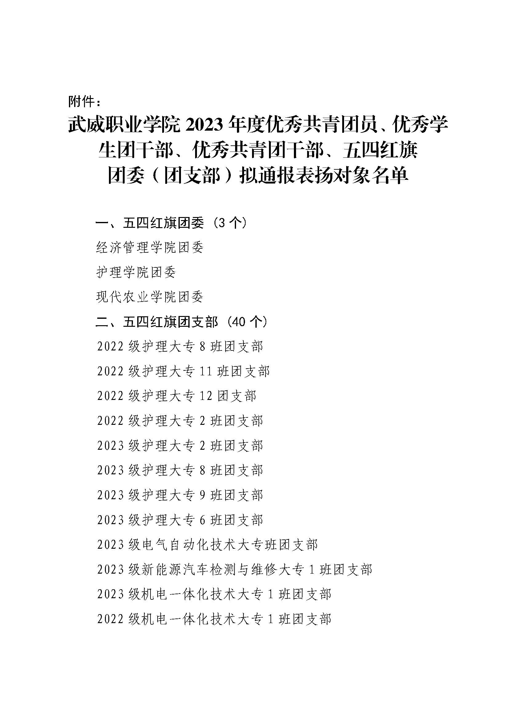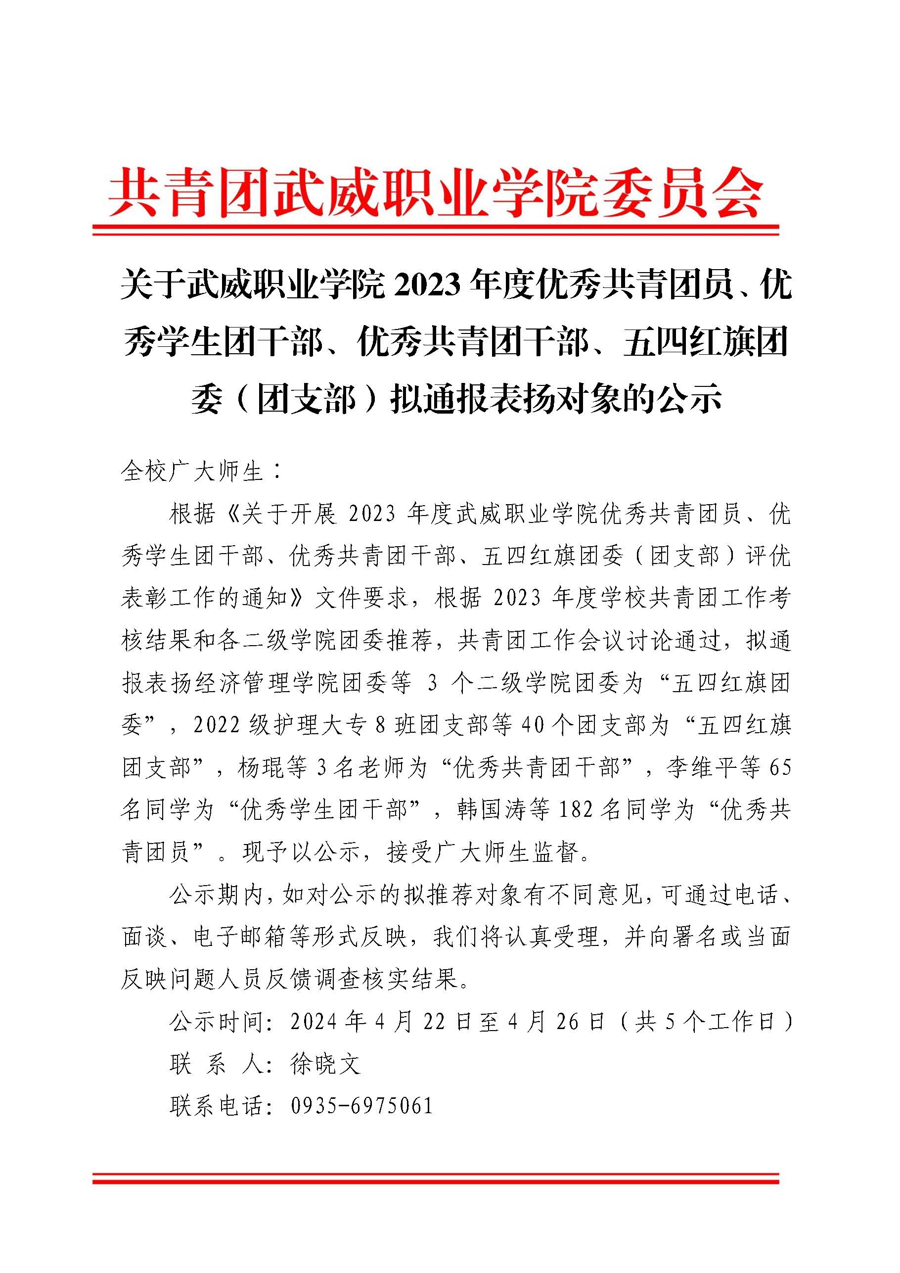 關(guān)于武威職業(yè)學(xué)院2023年度優(yōu)秀共青團員、優(yōu)秀學(xué)生團干部、優(yōu)秀共青團干部、五四紅旗團委(團支部)擬通報表揚對象的公示