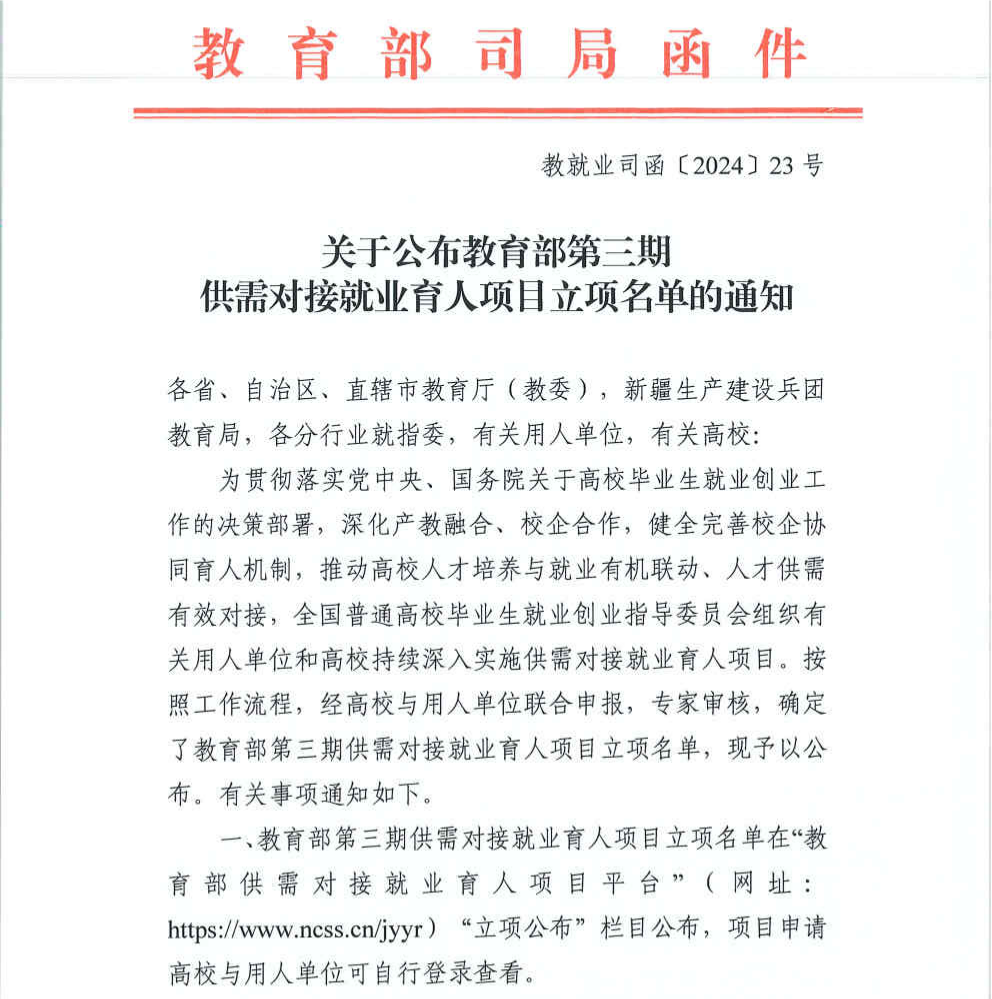 近日,教育部高校學生司下發(fā)《關于公布第三期供需對接就業(yè)育人項目立項名單的通知》,學校6個供需對接就業(yè)育人項目被批準立項,其中就業(yè)實習基地項目2個、人力資源提升項目1個、定向人才培養(yǎng)項目2個,重點領域校企合作項目1個。