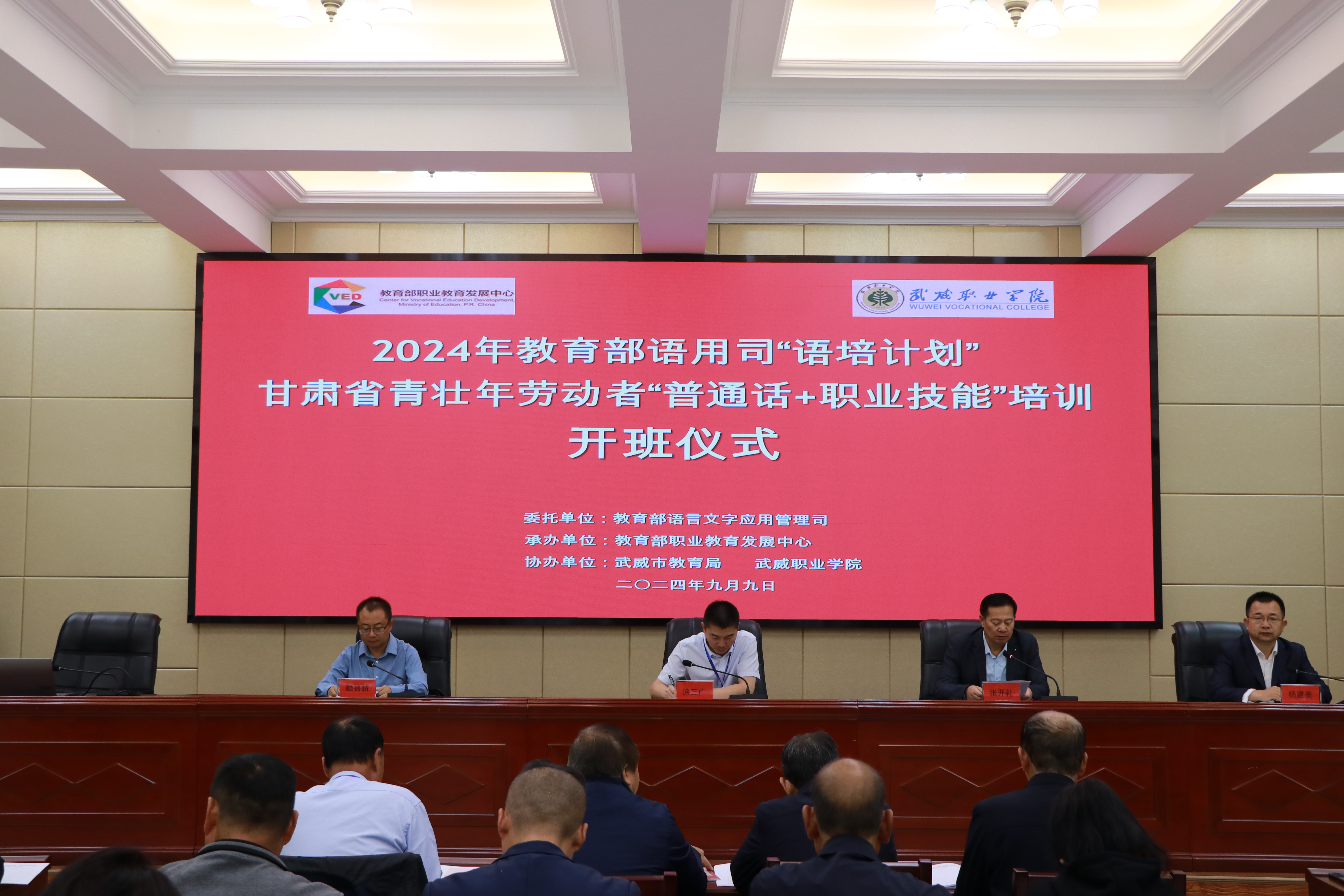 9月9日上午,2024年教育部語用司“語培計劃”甘肅省青壯年勞動者“普通話+職業(yè)技能”培訓(xùn)班在我校正式開班。本次培訓(xùn)是深入貫徹黨的二十大精神和二十屆三中全會精神,根據(jù)教育部語用司《關(guān)于實施2024年國家通用語言文字示范性培訓(xùn)計劃的通知》,受教育部語用司委托,由教育部職業(yè)教育發(fā)展中心承辦、武威市教育局、學(xué)校共同協(xié)辦。本次培訓(xùn)為期5天,共有來自武威市三縣一區(qū)的50余名學(xué)員參加。培訓(xùn)以“語言鋪路,技能致富”為主題,培訓(xùn)內(nèi)容聚焦當(dāng)?shù)剞r(nóng)業(yè)種植技術(shù)技能和畜牧業(yè)養(yǎng)殖技能開展,以古浪“紅禿頭”小麥、民勤蜜瓜等特色農(nóng)產(chǎn)品的栽培養(yǎng)殖技術(shù)為主線,設(shè)計了“普通話+職業(yè)技能”為主題的課程內(nèi)容,邀請了國家級普通話測試員、甘肅省農(nóng)業(yè)科學(xué)院專家、武威市農(nóng)科所專家等組成的專家團(tuán)隊。