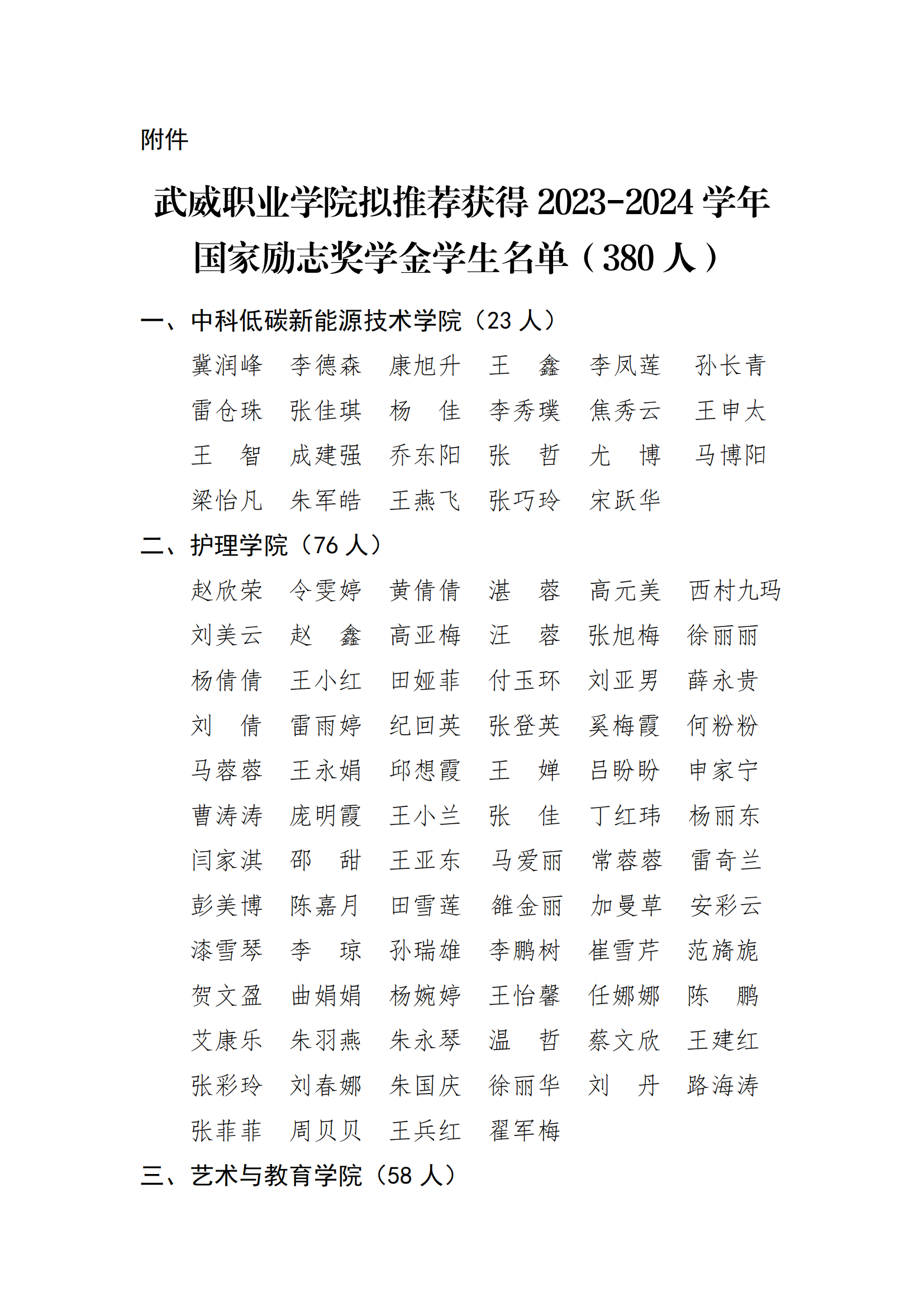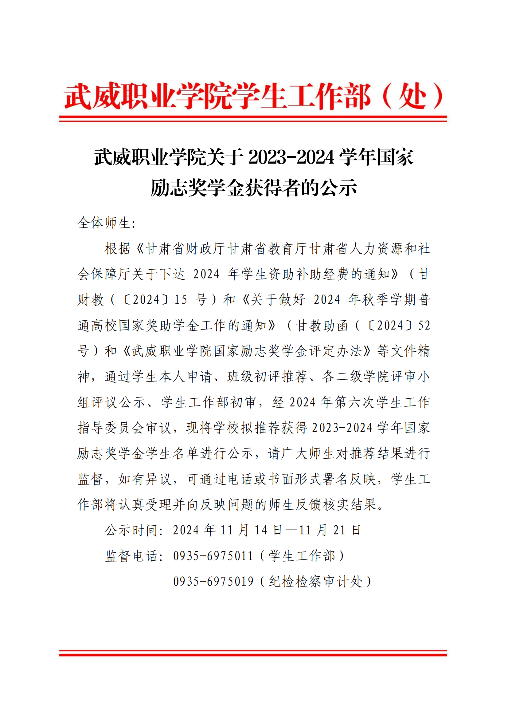 武威職業(yè)學院關于2023-2024學年國家勵志獎學金候選人的公示
