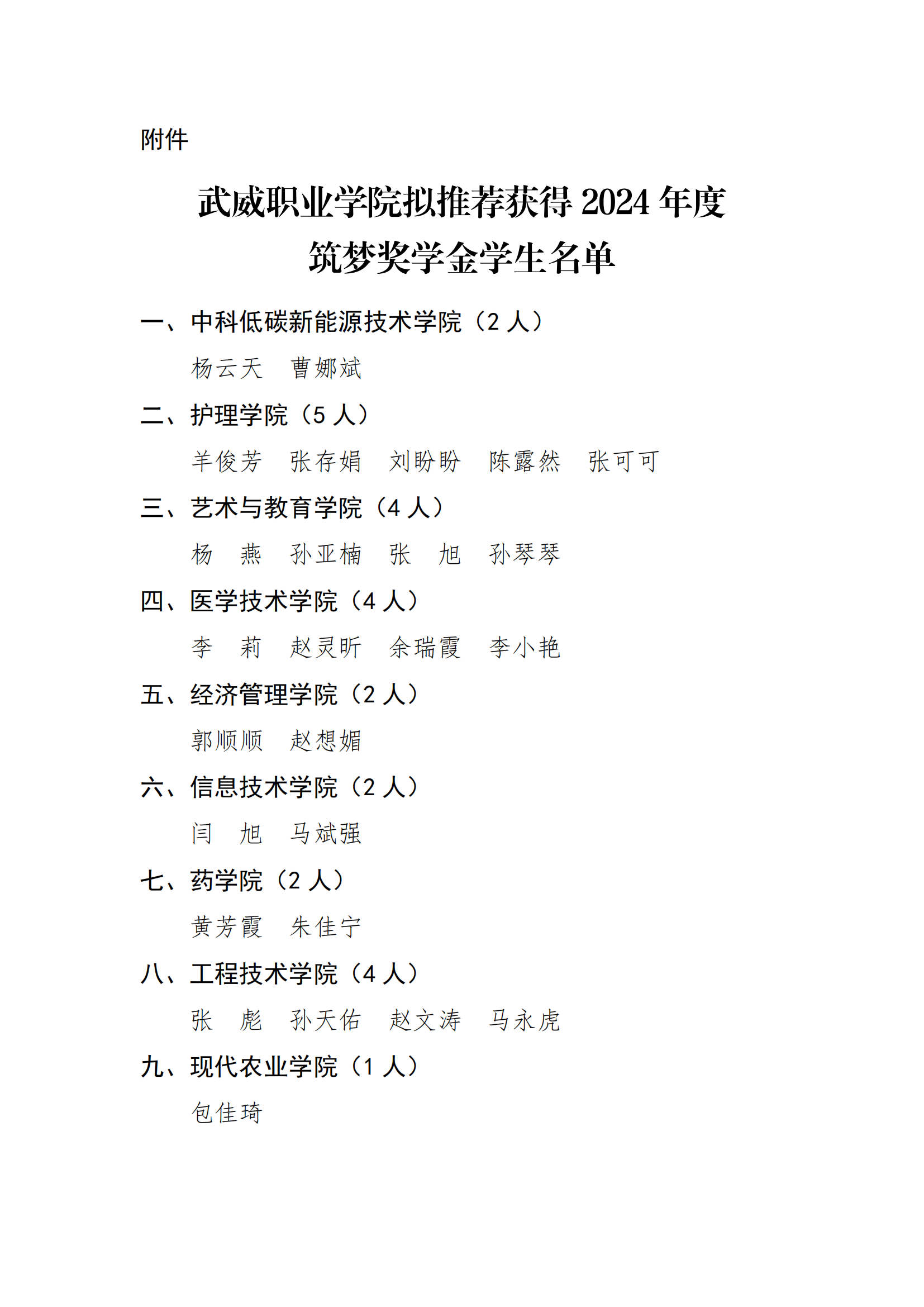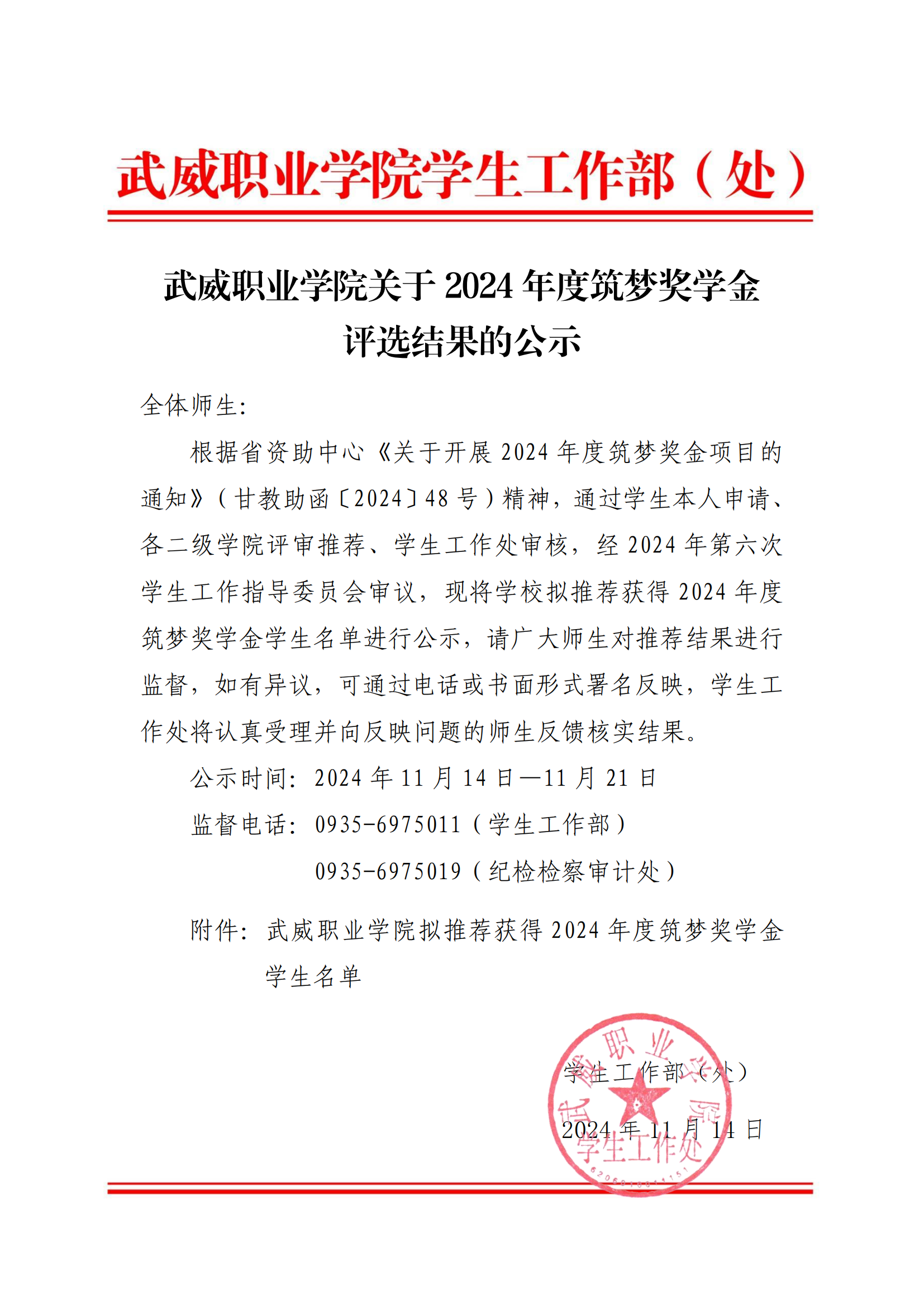 武威職業(yè)學(xué)院關(guān)于2024年度筑夢獎學(xué)金評選結(jié)果的公示