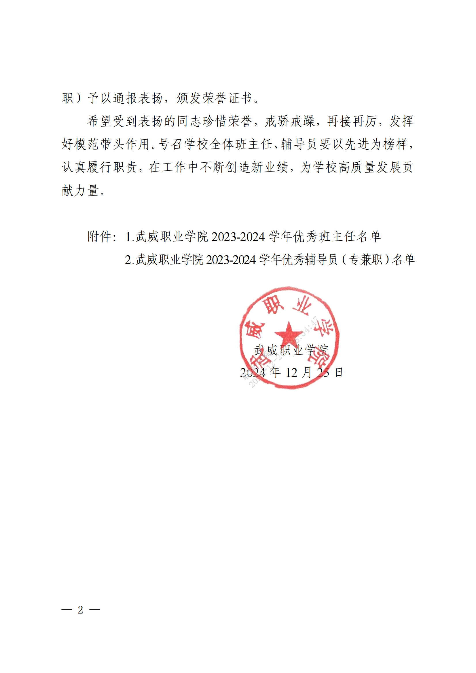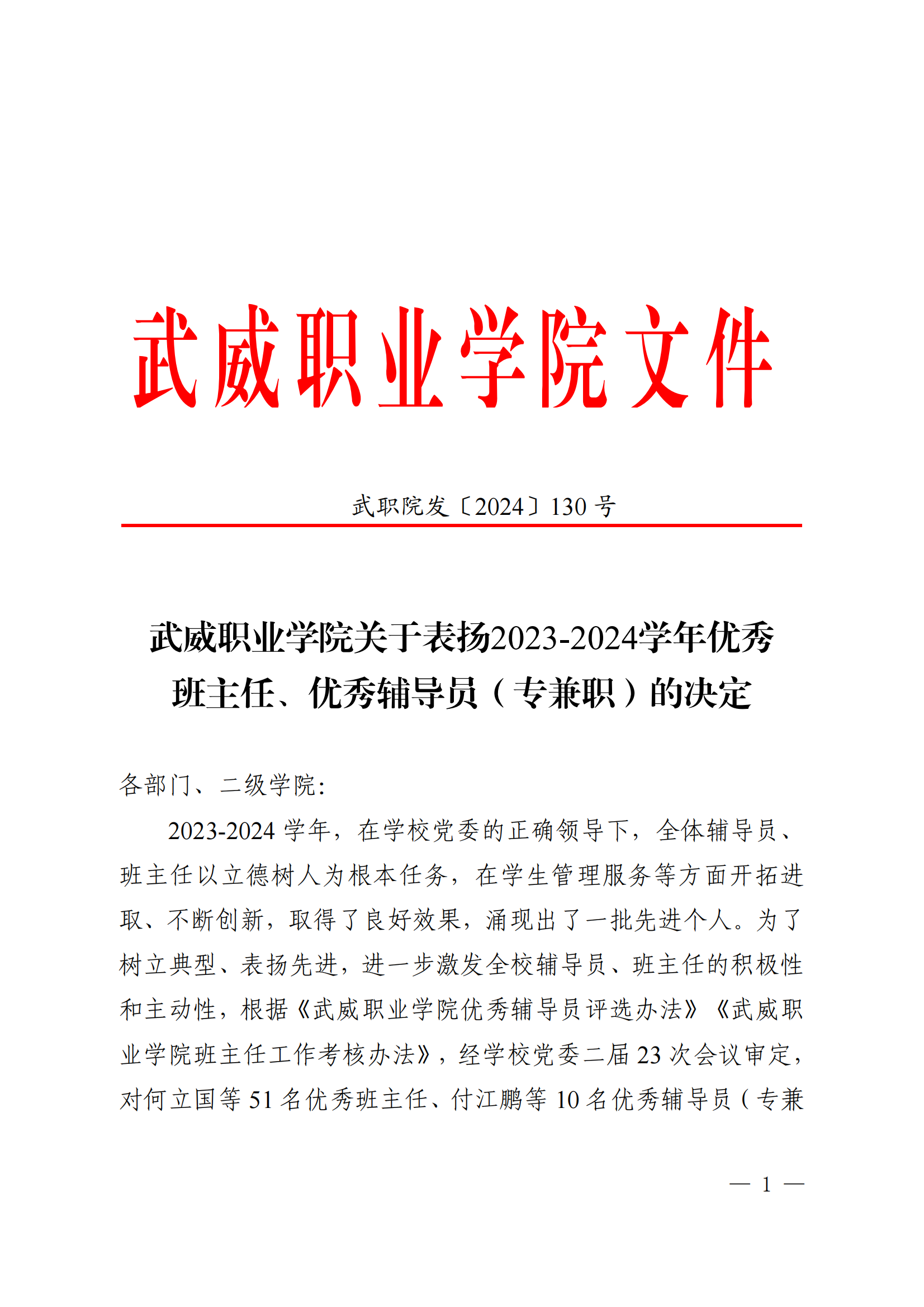 武威職業(yè)學(xué)院關(guān)于表揚(yáng)2023-2024學(xué)年優(yōu)秀班主任、優(yōu)秀輔導(dǎo)員(專兼職)的決定