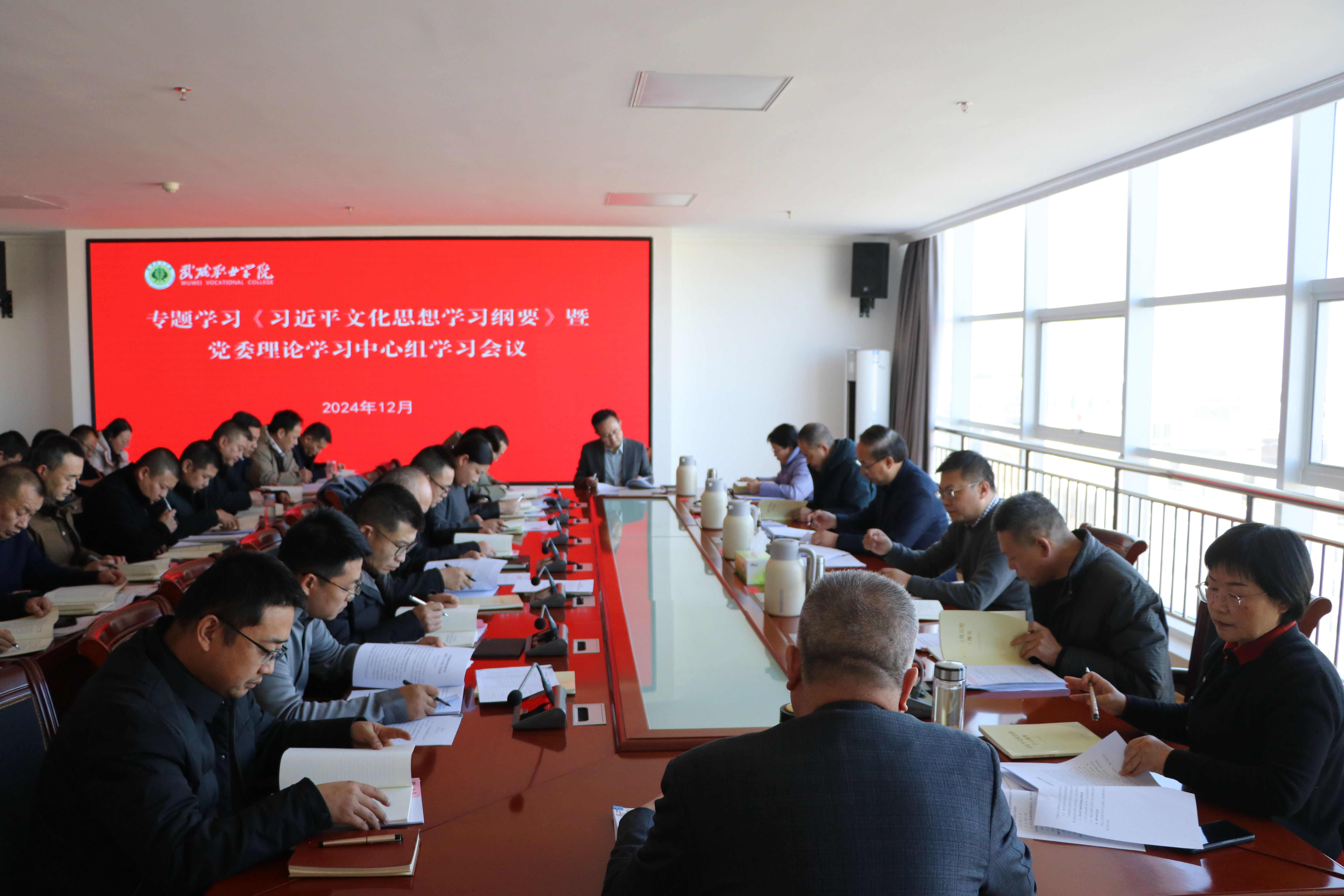 12月20日下午,學校召開《習近平文化思想學習綱要》專題學習暨黨委理論學習中心組學習會議。學校領導,各部門、二級學院主要負責人,各黨總支與直屬黨支部書記參加會議。黨委書記王宏主持會議并講話。