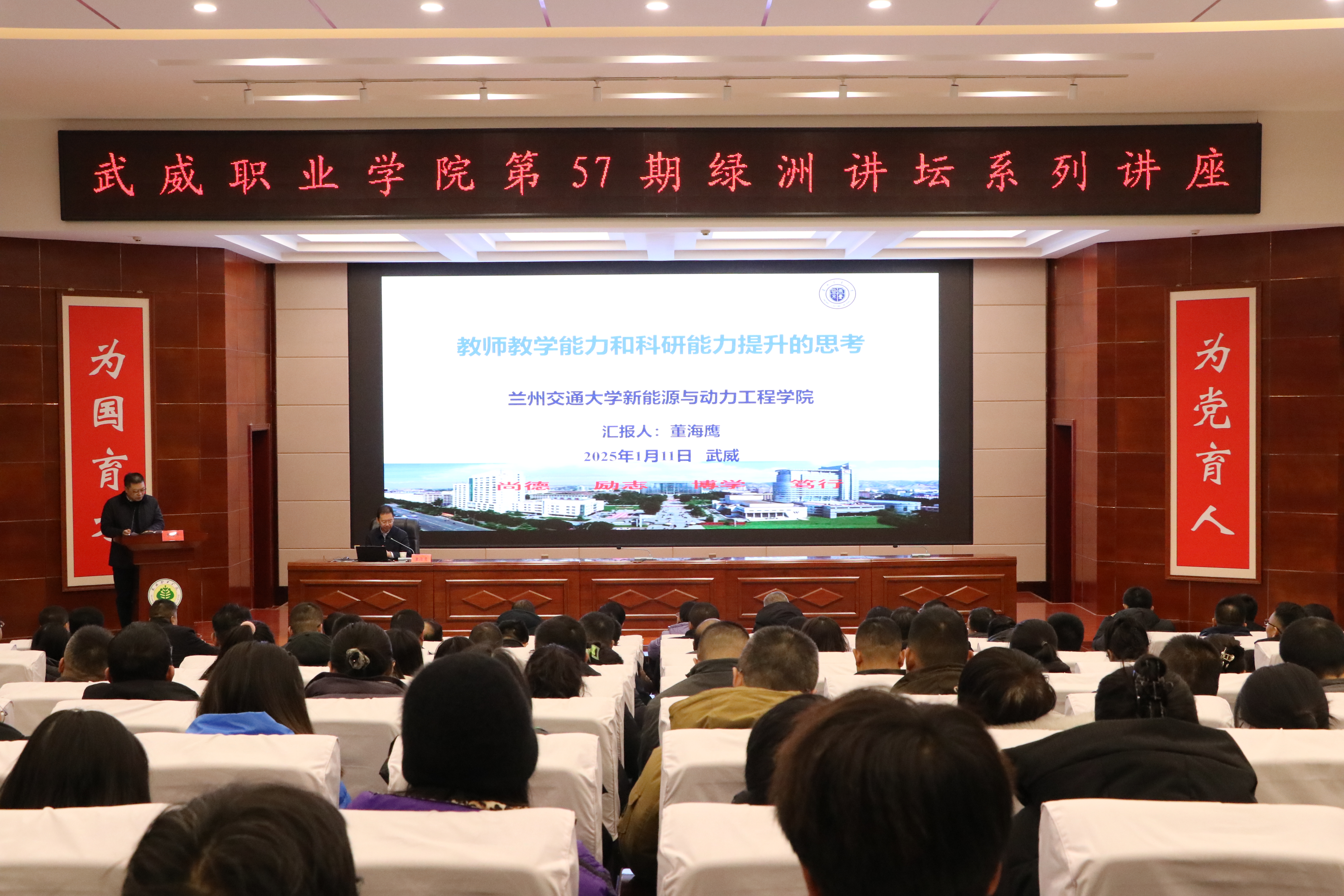 1月11日上午,學(xué)校特邀蘭州交通大學(xué)博士生導(dǎo)師董海鷹教授在菁英廳作了“教師教學(xué)能力和科研能力提升的思考”主題講座。講座由學(xué)校校長(zhǎng)李海軍主持,學(xué)校領(lǐng)導(dǎo)、中層管理干部、教研室主任及教師代表共210余人參加。
