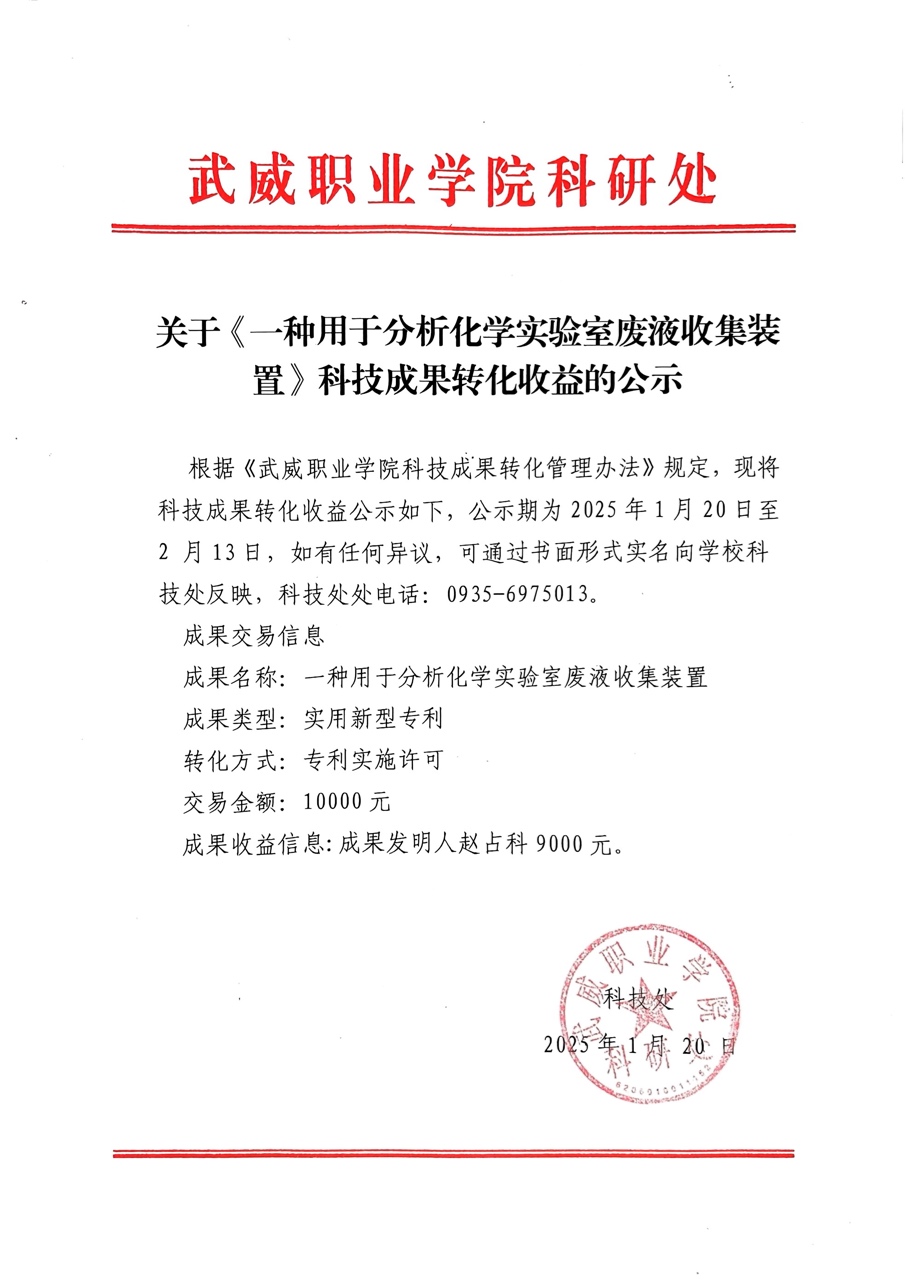 關(guān)于《一種用于分析化學(xué)實驗室廢液收集裝置》科技成果轉(zhuǎn)化收益的公示