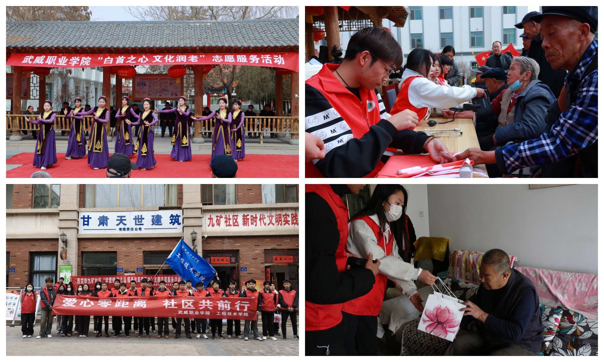 開(kāi)展愛(ài)老敬老志愿服務(wù)活動(dòng)。3月21日,校團(tuán)委組織50余名護(hù)理和學(xué)前教育專(zhuān)業(yè)志愿者,前往涼州區(qū)中心敬老院開(kāi)展“白首之心·文化潤(rùn)老”志愿服務(wù)活動(dòng),為老人捐贈(zèng)生活用品和愛(ài)心物資,開(kāi)展文藝表演慰問(wèn)演出,為老人測(cè)量血壓、血糖,告知在日常生活起居中的注意事項(xiàng),以專(zhuān)業(yè)技能守護(hù)老人健康。3月5日,工程技術(shù)學(xué)院35名志愿者走進(jìn)西關(guān)街九條嶺礦區(qū)社區(qū),開(kāi)展“愛(ài)心零距離社區(qū)共前行”志愿服務(wù)活動(dòng),為社區(qū)孤寡老人、獨(dú)居老人和老黨員等特殊家庭送上慰問(wèn)品,打掃衛(wèi)生、擦拭家具,幫忙照料綠植,并與社區(qū)工作者一起規(guī)范擺放社區(qū)內(nèi)亂停亂放的自行車(chē)、電動(dòng)車(chē),清潔窗戶(hù)、地面,營(yíng)造整潔有序的社區(qū)環(huán)境。