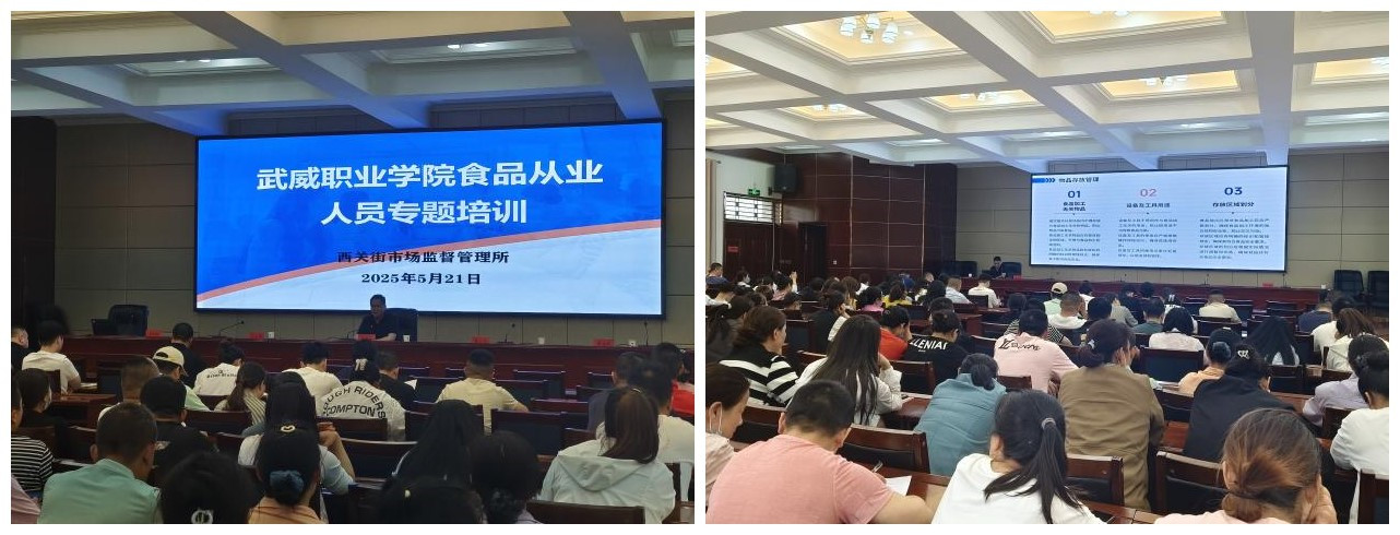 5月21日下午,學(xué)校邀請(qǐng)涼州區(qū)市場(chǎng)監(jiān)管局副局長(zhǎng)汪大勇、西關(guān)街市場(chǎng)監(jiān)督管理所所長(zhǎng)秦榮華開展食品安全專題培訓(xùn)。學(xué)生食堂、超市、后勤服務(wù)樓管理人員和全體從業(yè)人員200余人參加培訓(xùn)。培訓(xùn)由后勤管理處處長(zhǎng)占發(fā)禹主持。