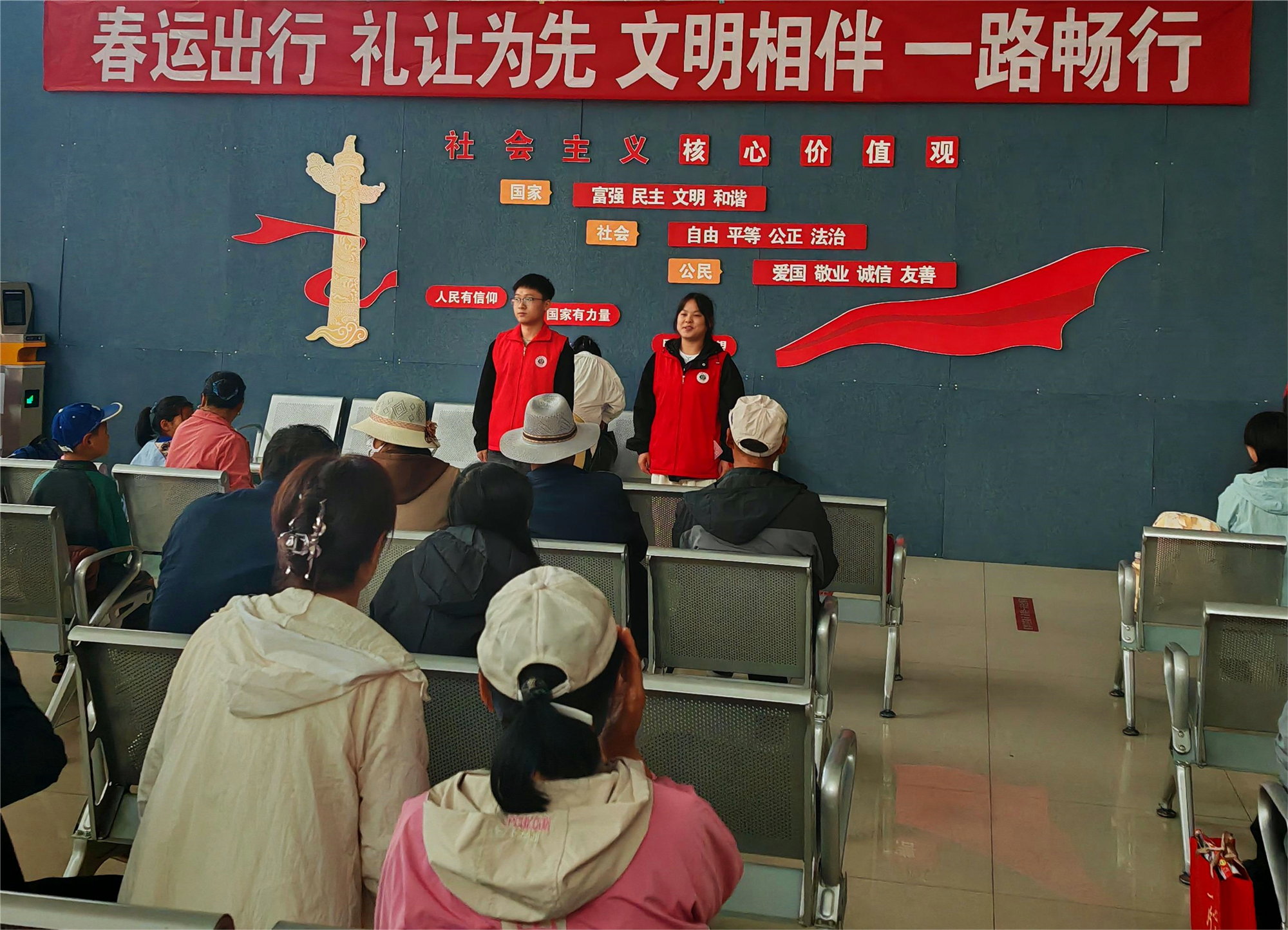 活動現(xiàn)場,志愿者們通過豐富多彩的形式推廣普通話,宣傳文明交通新風(fēng)尚。在車站候車室,志愿者深情誦讀《祖國啊,我親愛的祖國》《黃河頌》等經(jīng)典篇目,吸引眾多候車乘客駐足聆聽。志愿者邀請車站內(nèi)的小旅客們一同參與朗誦,在互動中感受語言文字的魅力,營造了濃厚的文化氛圍。此外,團隊還向乘客發(fā)放文明乘車、文明出行倡議書,倡導(dǎo)安全出行、文明乘車的良好風(fēng)尚。