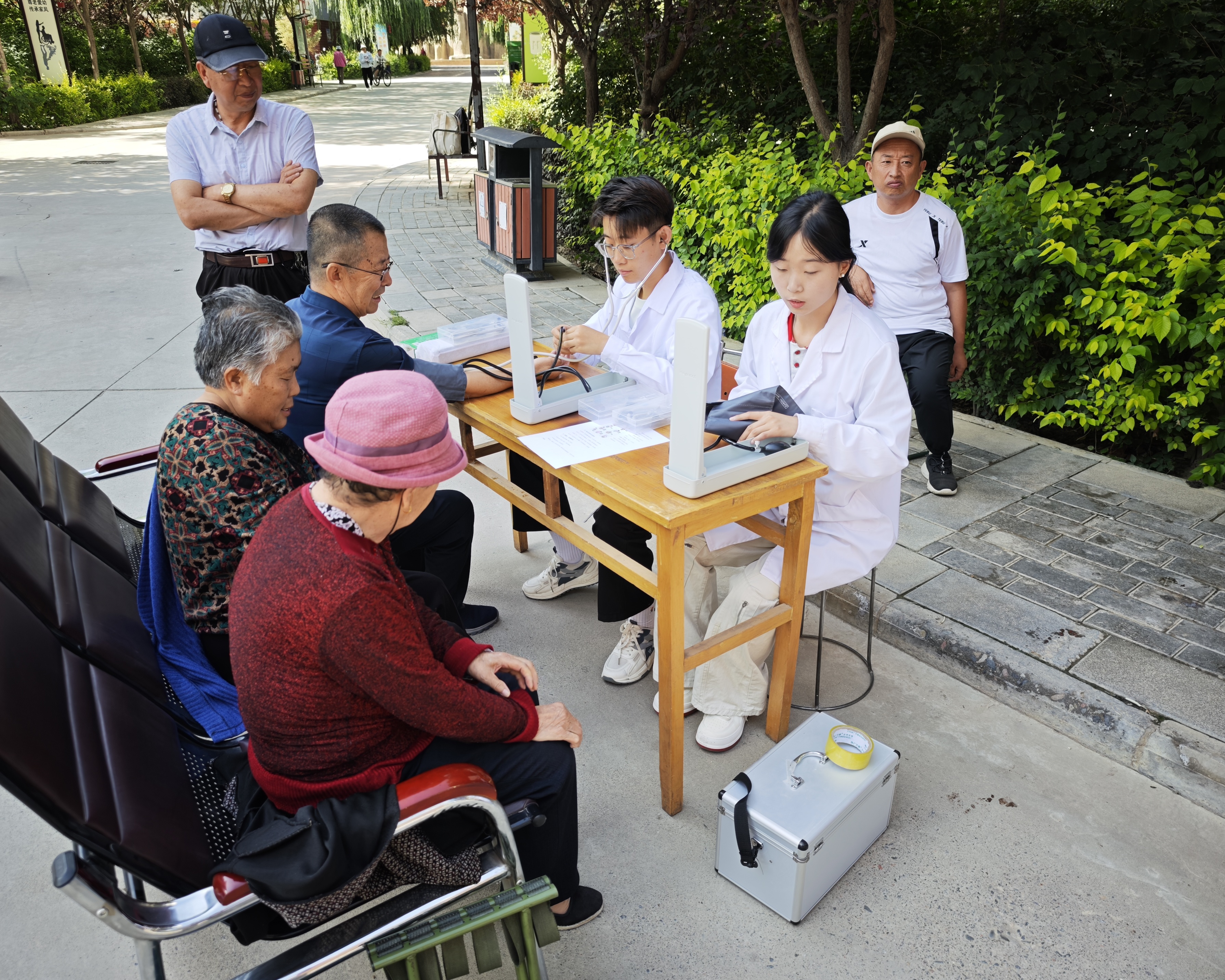 在指導(dǎo)老師的帶領(lǐng)下,志愿者們走進(jìn)武威市涼州區(qū)窯溝村,他們手持血壓計(jì)為村民細(xì)心測(cè)量,指尖傳遞著溫暖的守護(hù)。針對(duì)常見(jiàn)的高血壓?jiǎn)栴},志愿者們將書本的醫(yī)學(xué)知識(shí)化作“少鹽多醋常走動(dòng)”的貼心叮嚀;艾灸棒在老人膝蓋處揮舞,老人們微闔雙眼,皺紋間舒展開寧?kù)o的笑意。志愿者精心準(zhǔn)備了蘊(yùn)含中藥智慧的五色香囊,讓預(yù)防保健的種子在老人們心中生根發(fā)芽。