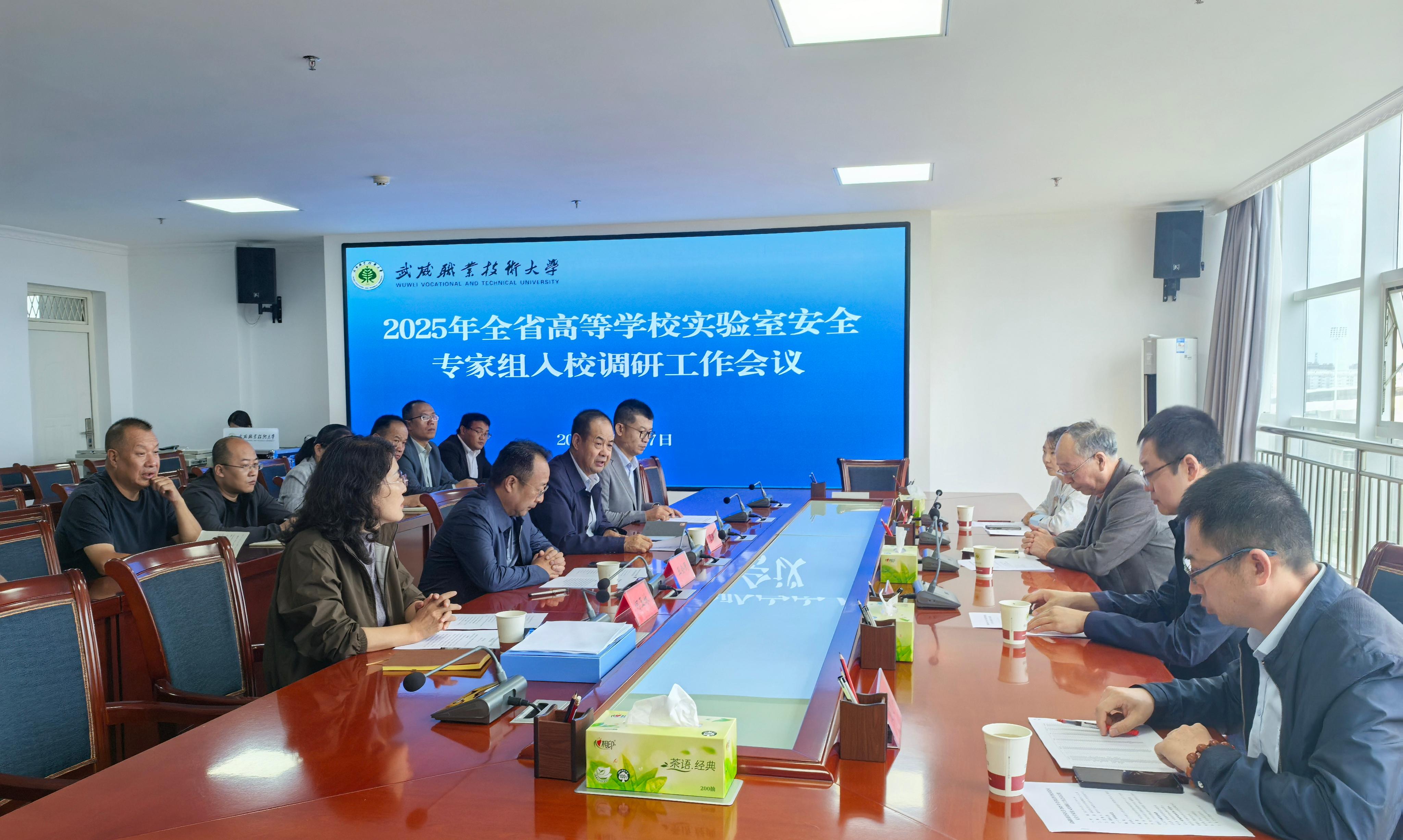 根據(jù)《甘肅省教育廳關(guān)于組織開展2025年高等學(xué)校實(shí)驗(yàn)室安全工作的通知》要求和安排部署,8月27日,省教育廳高校實(shí)驗(yàn)室安全調(diào)研專家組一行蒞臨學(xué)校開展實(shí)驗(yàn)室安全工作調(diào)研。武威市教育局副局長王會(huì)民、學(xué)校黨委副書記翟存祥、相關(guān)部門及學(xué)院(部)負(fù)責(zé)人參加會(huì)議。