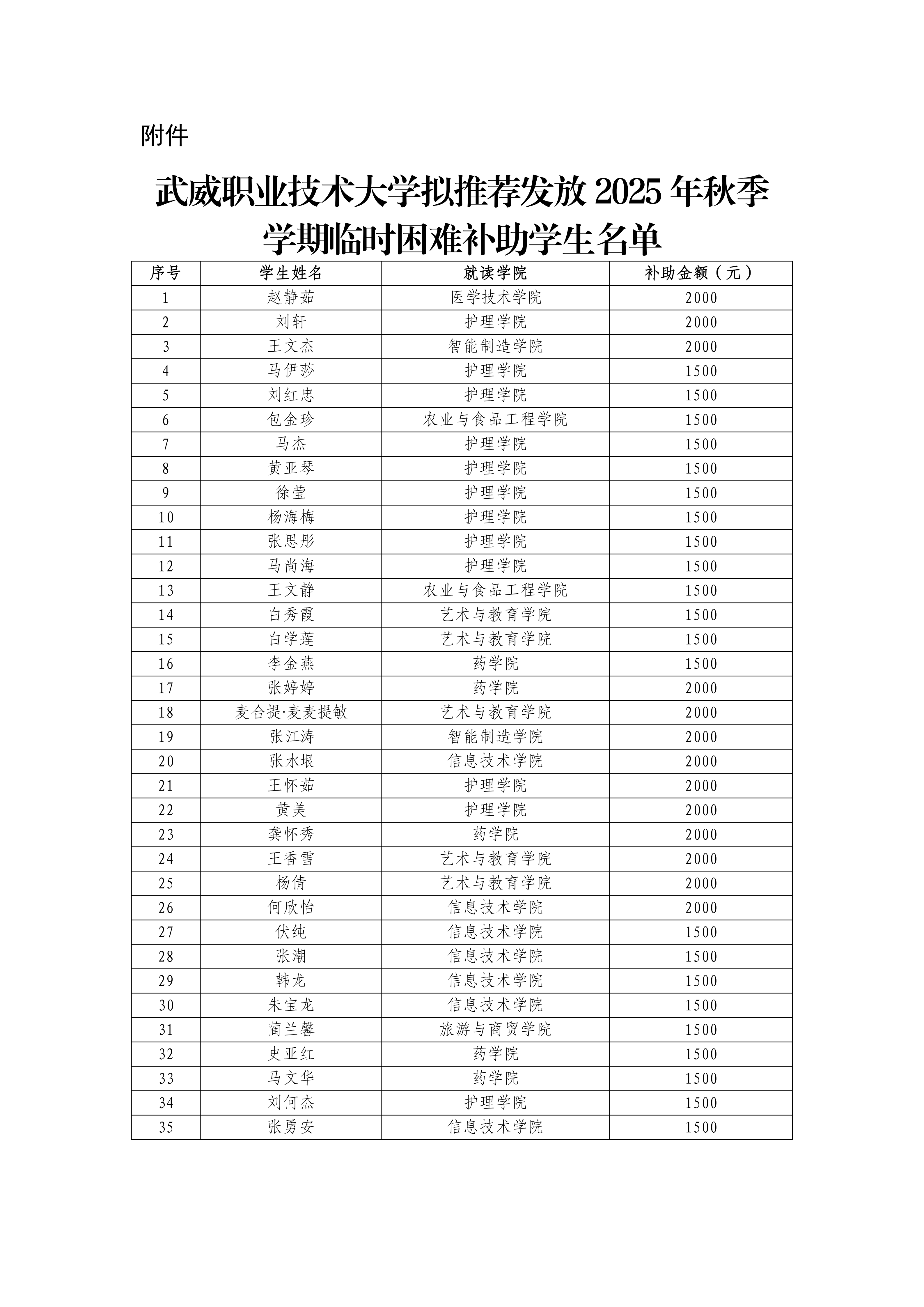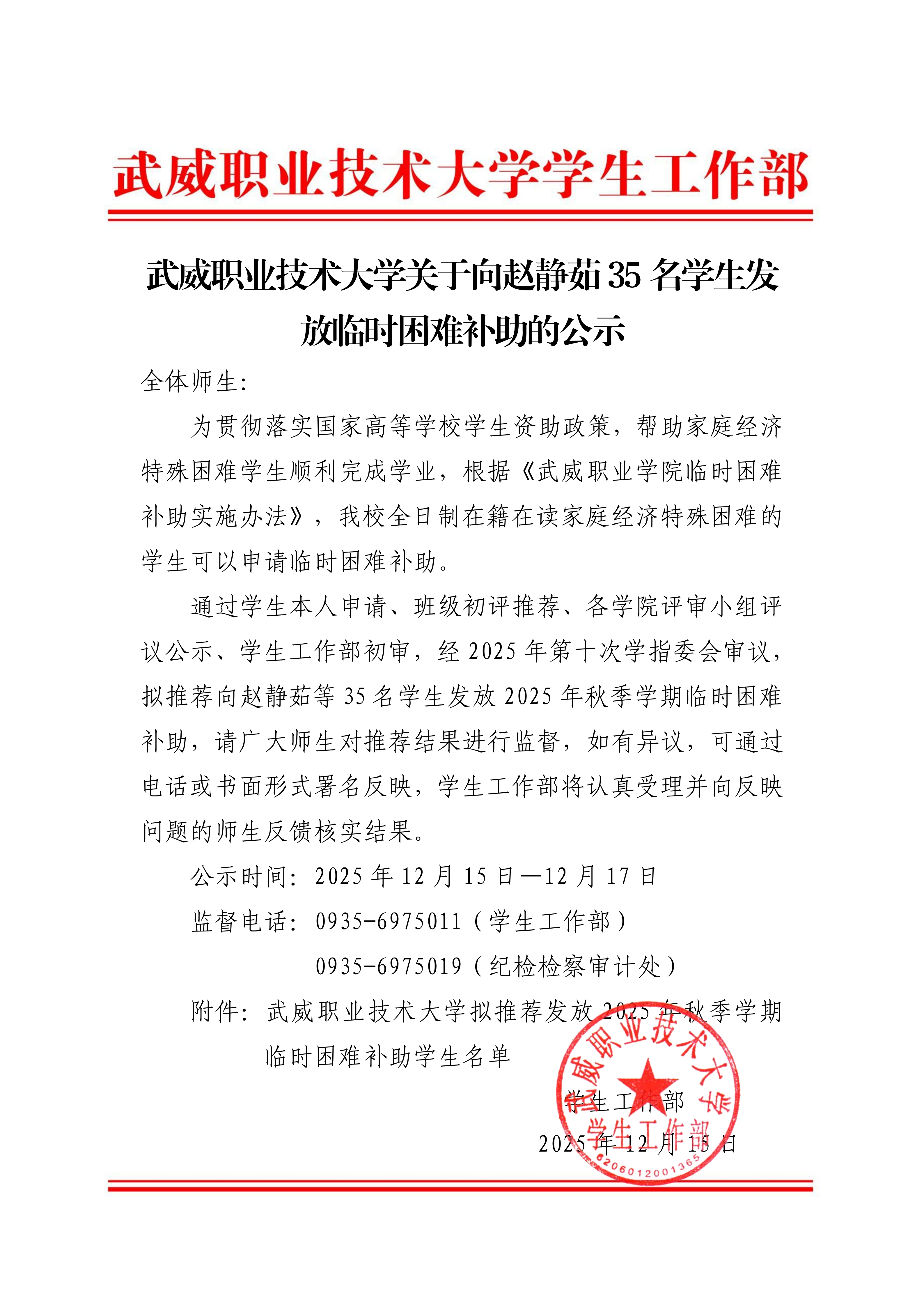 武威職業(yè)技術(shù)大學(xué)關(guān)于向趙靜茹35名學(xué)生發(fā)放臨時困難補助的公示