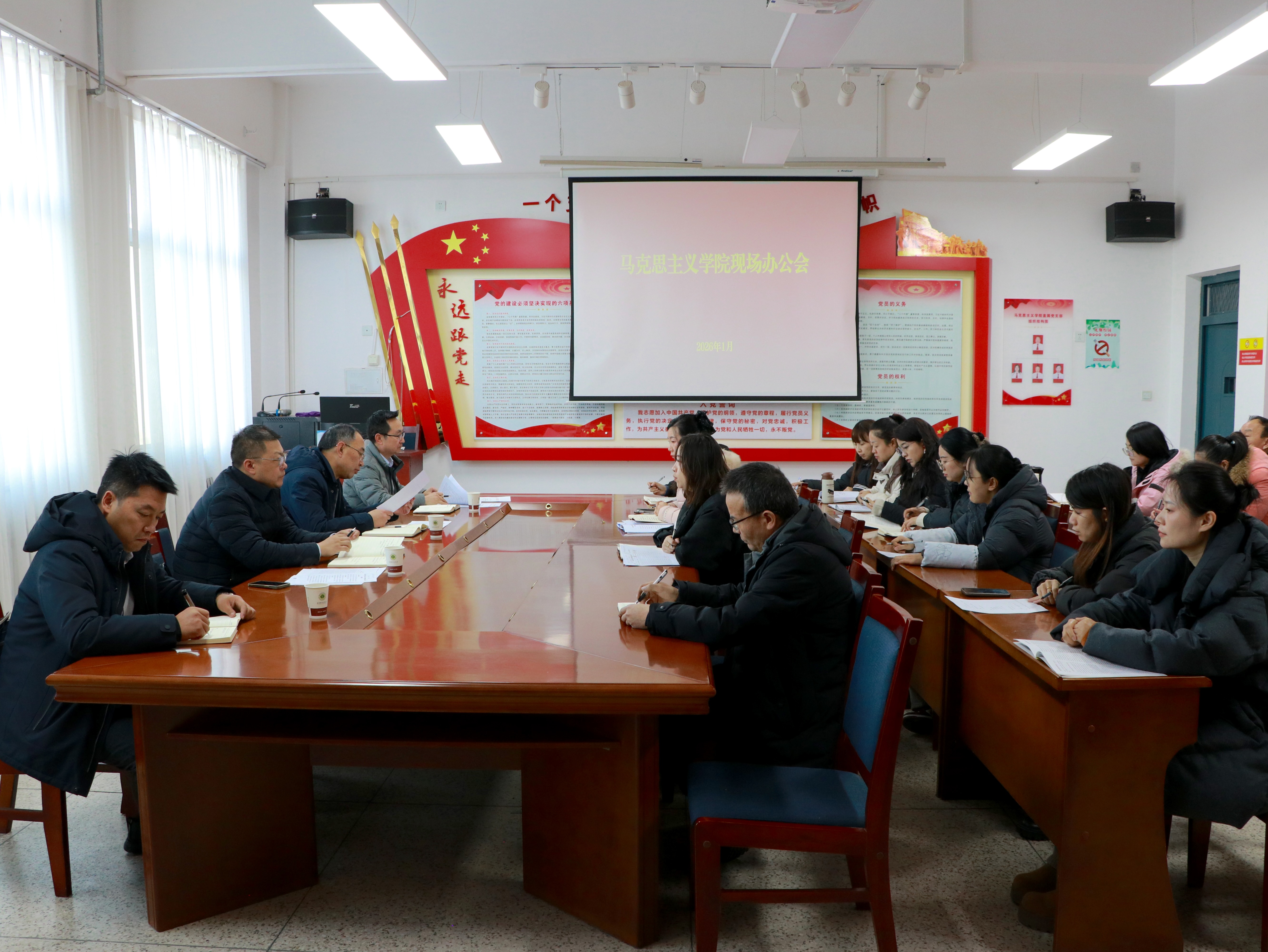 為扎實(shí)推進(jìn)馬克思主義學(xué)院內(nèi)涵式發(fā)展,1月9日,黨委書(shū)記王宏,校長(zhǎng)李海軍深入馬克思主義學(xué)院召開(kāi)現(xiàn)場(chǎng)辦公會(huì),聚焦學(xué)院發(fā)展實(shí)際需求,現(xiàn)場(chǎng)辦公協(xié)調(diào)解決關(guān)鍵問(wèn)題。辦公室負(fù)責(zé)人董鵬、學(xué)院全體教師參加會(huì)議。馬克思主義學(xué)院黨總支書(shū)記任陶主持會(huì)議。