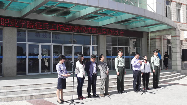 在宣傳大會上,武威軍分區(qū)向?qū)W院授予了“武威職業(yè)學院征兵工作站”牌。學院副院長潘玉華做了表態(tài)發(fā)言,她表示,學院將以今天的授牌儀式暨征兵宣傳大會為契機,認真貫徹黨中央、國務院、中央軍委關(guān)于加強大學生征兵工作的重要決策部署及省、市委總體要求,全面落實2016年全省大學生征兵工作網(wǎng)絡視頻會議精神,進一步健全我院大學生征兵工作體制機制,通過多種形式,廣泛深入開展宣傳教育工作,讓每位學生都能及時全面的獲知征兵政策和信息,鼓勵、引導、動員我院學生積極應征入伍,圓滿完成征兵任務,為部隊輸送更好更多的高素質(zhì)兵源,推動我院大學生征兵工作邁上新的臺階。