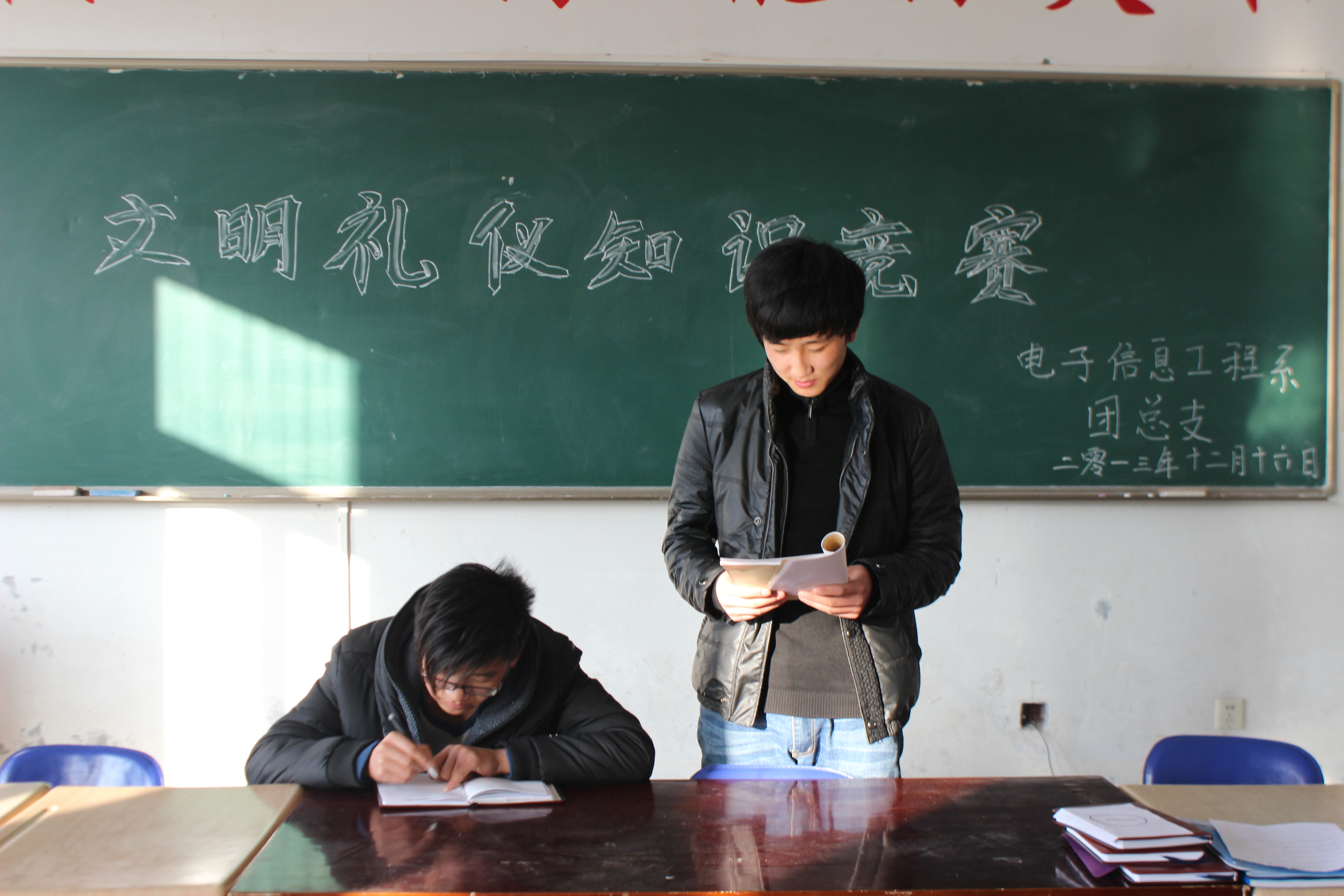 2013年12月16日晚,電子信息工程系團(tuán)總支在1-304教室組織開展電信系文明禮儀知識競賽;來自電信系2012、2013級8個大專班的24名同學(xué)參加此次活動。
