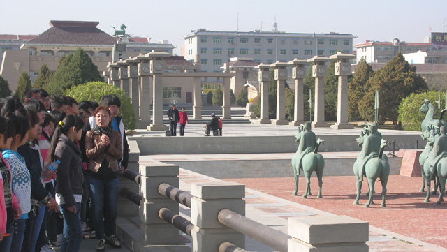 同學(xué)們在講解員的帶領(lǐng)下,首先從漢風(fēng)格大門"中華第一門"開始、參觀了天下第一馬"馬踏飛燕"、凝聚漢文化精粹的巨型浮雕、牌樓、圖騰柱以及堪稱"世界之最"的整體放大6倍的99件銅車馬儀仗俑隊(duì)列,最后參觀了雷臺漢文化陳列館.