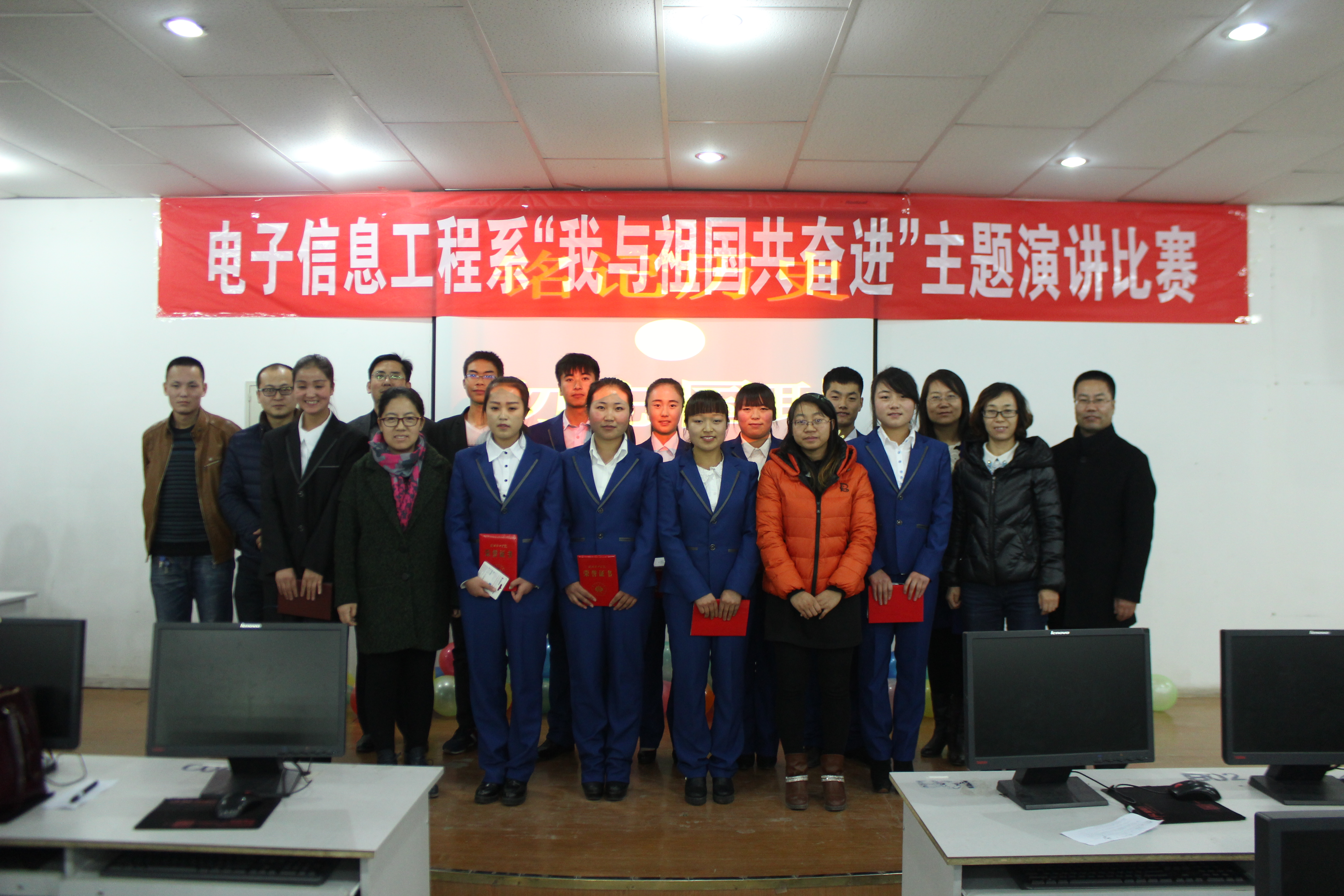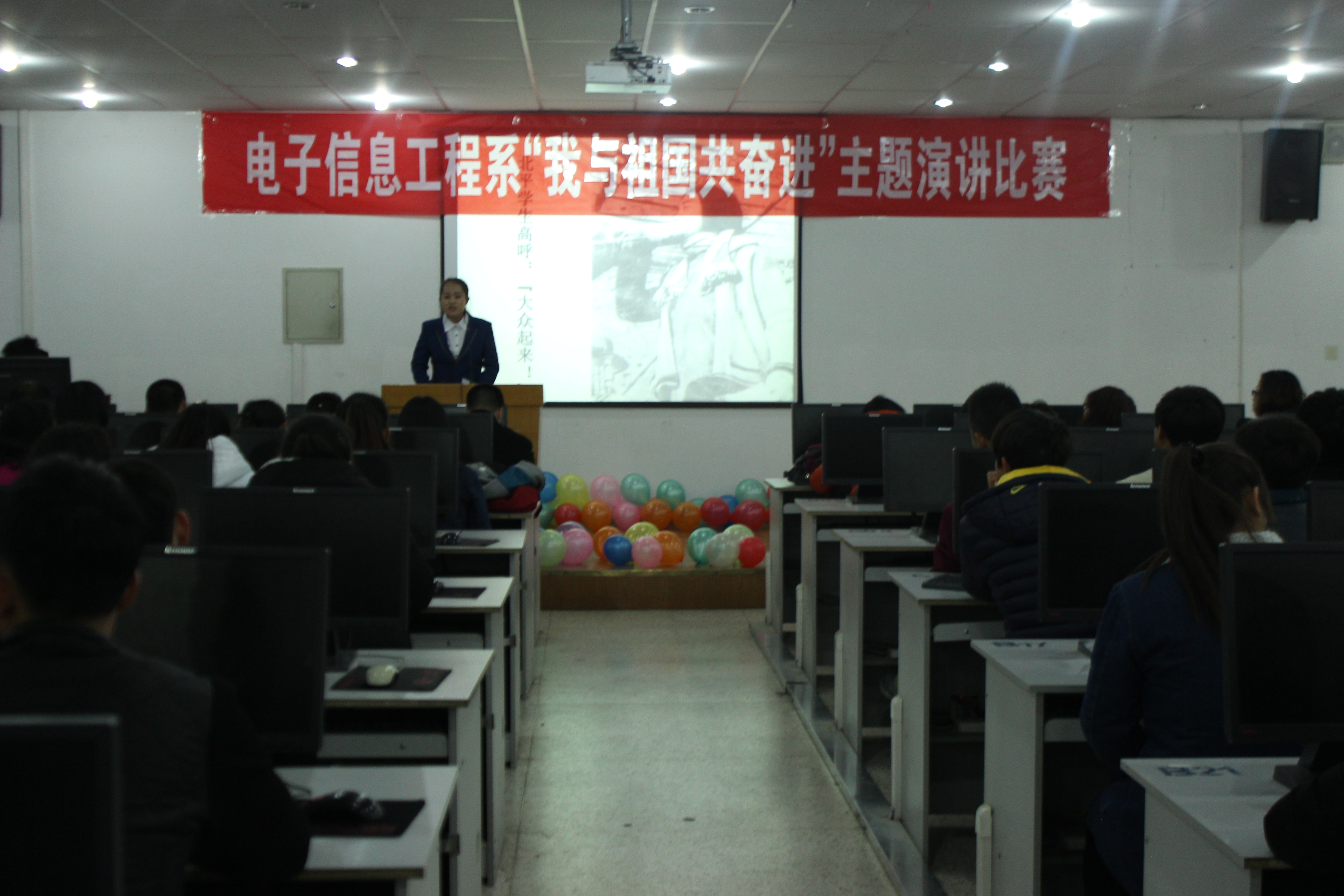 為紀(jì)念“12·9”學(xué)生愛(ài)國(guó)運(yùn)動(dòng)80周年,激發(fā)我系青年學(xué)生的愛(ài)國(guó)熱情和報(bào)國(guó)之志,進(jìn)一步培育和踐行社會(huì)主義核心價(jià)值觀,提高學(xué)生思想政治素質(zhì),12月6日晚,電子信息工程系在尚德樓11號(hào)機(jī)房舉辦了“我與祖國(guó)共奮進(jìn)”主題演講比賽。電子信息工程系黨總支書記張伯成、輔導(dǎo)員鄧偉華、團(tuán)總支書記唐宗舜、全體班主任及系團(tuán)總支180多名團(tuán)員青年觀看了比賽。