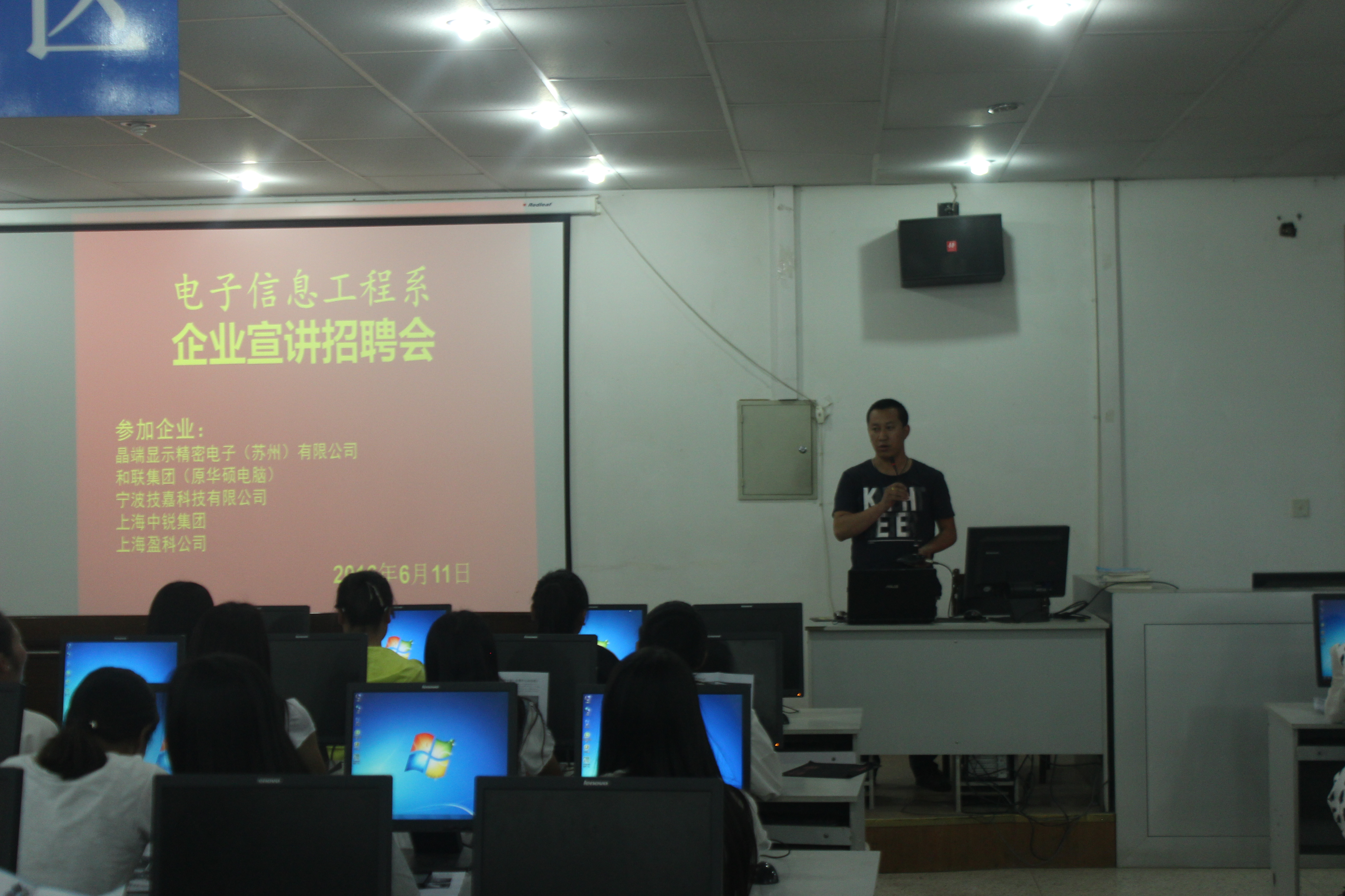 為更好的做好2014級學(xué)生頂崗實習(xí)的工作,6月11日,電子信息工程系在學(xué)院十號機(jī)房舉辦了企業(yè)專場招聘會,2014級全體學(xué)生參加了招聘會。參會的五家企業(yè)是:晶端顯示精密電子(蘇州)有限公司、上海中銳集團(tuán)、寧波技嘉科技有限公司、和聯(lián)集團(tuán)(原華碩電腦)和上海電訊盈科公司。