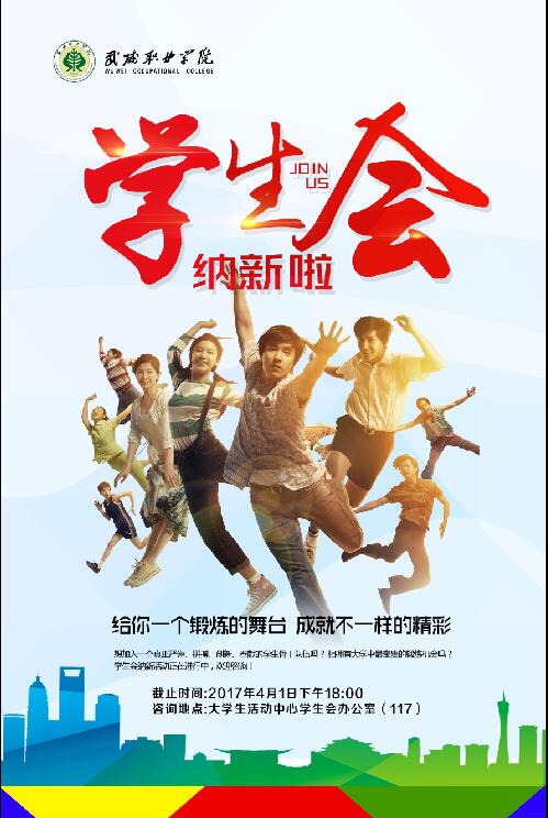 武威職業(yè)學(xué)院學(xué)生會是在學(xué)院黨委領(lǐng)導(dǎo)下,院團(tuán)委指導(dǎo)下,學(xué)生自發(fā)組織的群眾性學(xué)生組織。為進(jìn)一步加強(qiáng)學(xué)院學(xué)生會隊(duì)伍建設(shè),為廣大同學(xué)提供一個自我鍛煉的平臺,院團(tuán)委研究決定面向2016級全體同學(xué)公開招聘學(xué)院學(xué)生會干部?,F(xiàn)將具體事宜通知如下: