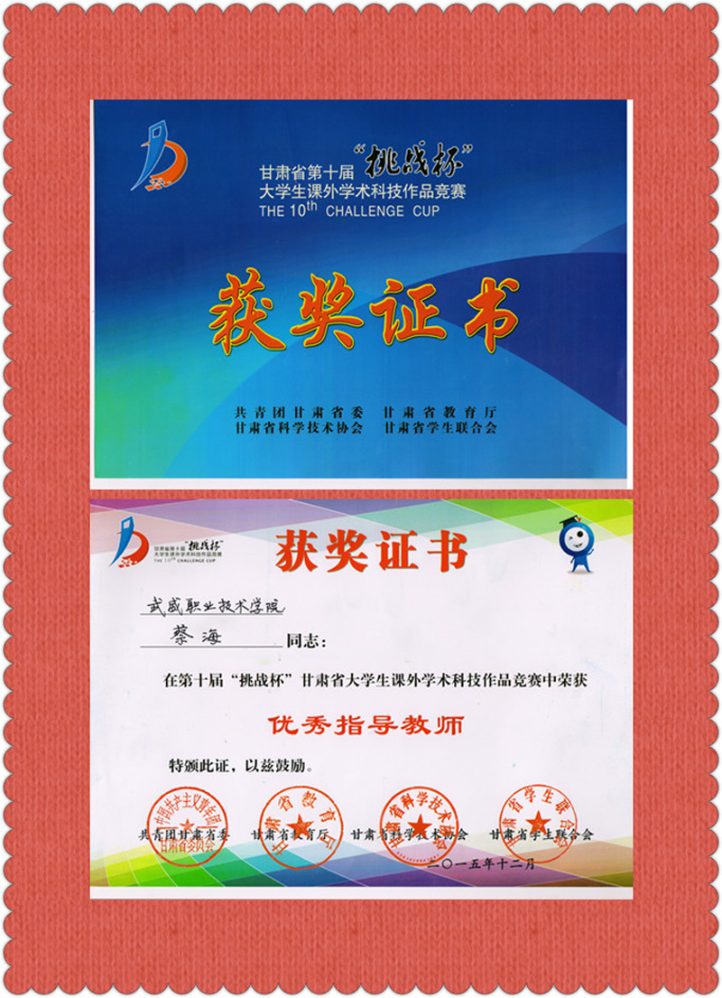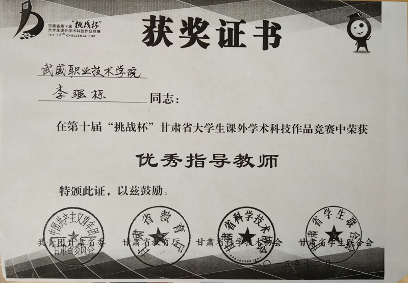 2015年6月23日,現(xiàn)代農(nóng)業(yè)技術(shù)系教師蔡海、李強(qiáng)棟赴西北師范大學(xué),參加由共青團(tuán)甘肅省委、甘肅省教育廳、甘肅省科學(xué)技術(shù)學(xué)會(huì)、甘肅省學(xué)生聯(lián)合會(huì)舉辦的甘肅省第十屆大學(xué)生“挑戰(zhàn)杯”大學(xué)生課外學(xué)術(shù)科技作品競賽,獲得優(yōu)秀指導(dǎo)教師榮譽(yù)稱號(hào)。
