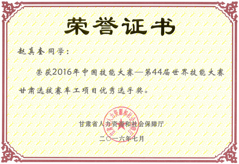 第44屆世界技能大賽甘肅選拔賽車工項(xiàng)目?jī)?yōu)秀獎(jiǎng)