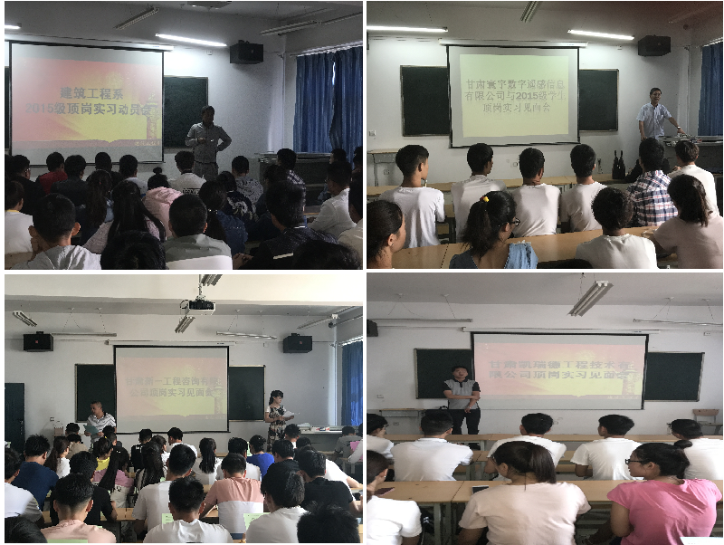 6月8日至6月16日,甘肅寰宇數(shù)字遙感信息有限公司、甘肅新一工程咨詢有限公司、國(guó)誠(chéng)集團(tuán)、蘭州凱瑞德工程有限公司、武威盛大集團(tuán)等實(shí)習(xí)接收單位,派專人來(lái)校,舉辦企業(yè)宣講會(huì),詳細(xì)地介紹了用人單位的管理制度、日常生活、工作崗位、薪酬待遇等,并與系上洽談了學(xué)生頂崗實(shí)習(xí)合作辦法、責(zé)任義務(wù)、安全保障、就業(yè)等涉及學(xué)生諸方面的合作細(xì)節(jié)。