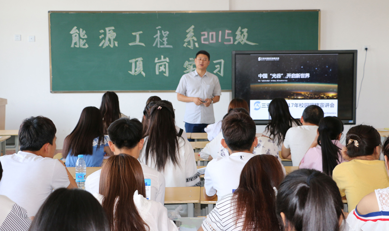 為進一步深化校企合作,提供更優(yōu)質(zhì)的頂崗實習崗位,6月26日早上,能源工程系邀請校企合作企業(yè)安徽三安光電有限公司和晶科能源有限公司工作人員在我系洽談校企合作事宜,并對即將進入實習的2015級學生做頂崗實習宣講。