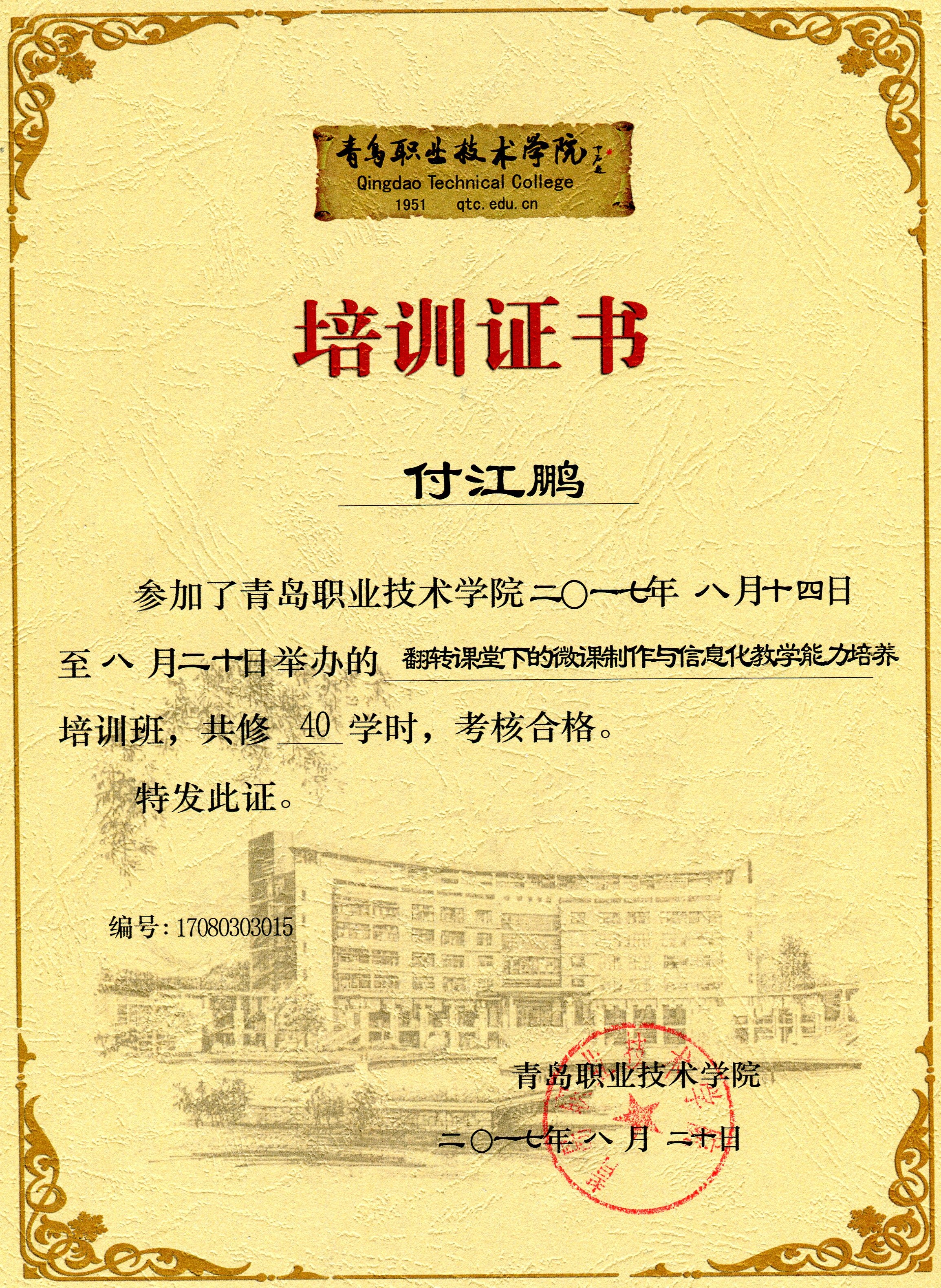 2017.8.14-8.20,我參加了由山東省教育廳在青島職業(yè)技術(shù)學(xué)院舉辦的《高校教師教學(xué)能力、信息技術(shù)與專業(yè)素養(yǎng)提升高級(jí)培訓(xùn)班》聯(lián)盟培訓(xùn)班。