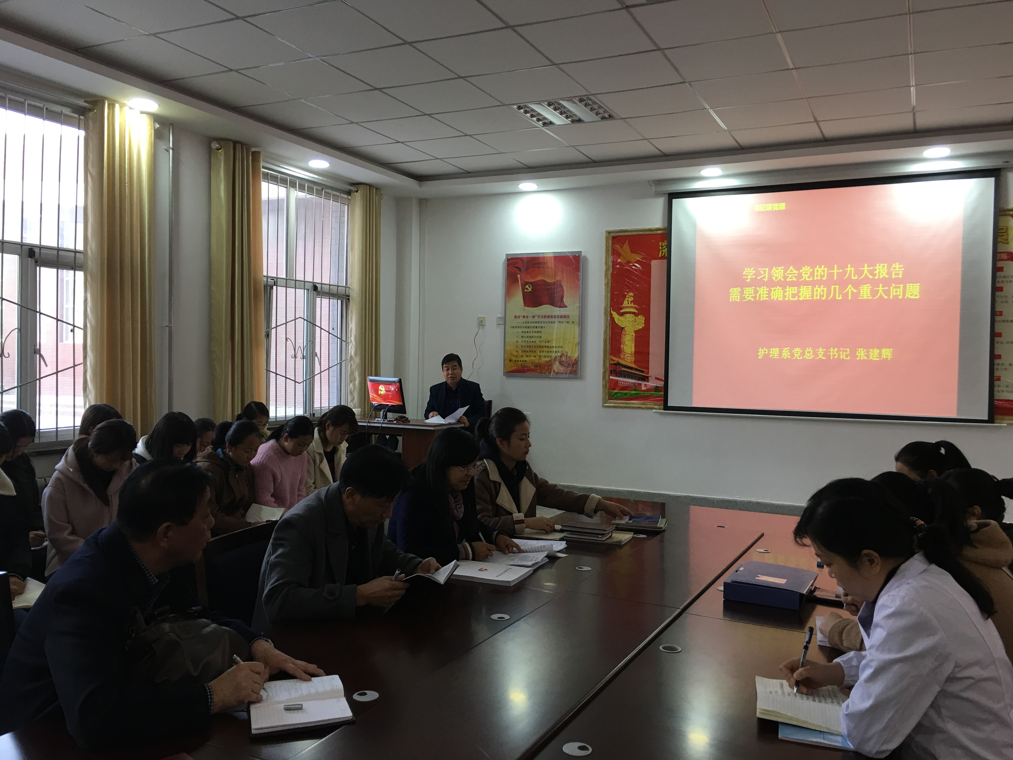11月17日,護理系黨支部支召開全體黨員大會,黨總支書記張建輝講黨課,就《學習領(lǐng)會黨的十九大報告需要準確把握的幾個重大問題》進行專題黨課輔導,促進全體黨員對十九大精神的學習理解。護理系入黨積極分子聆聽了黨課。