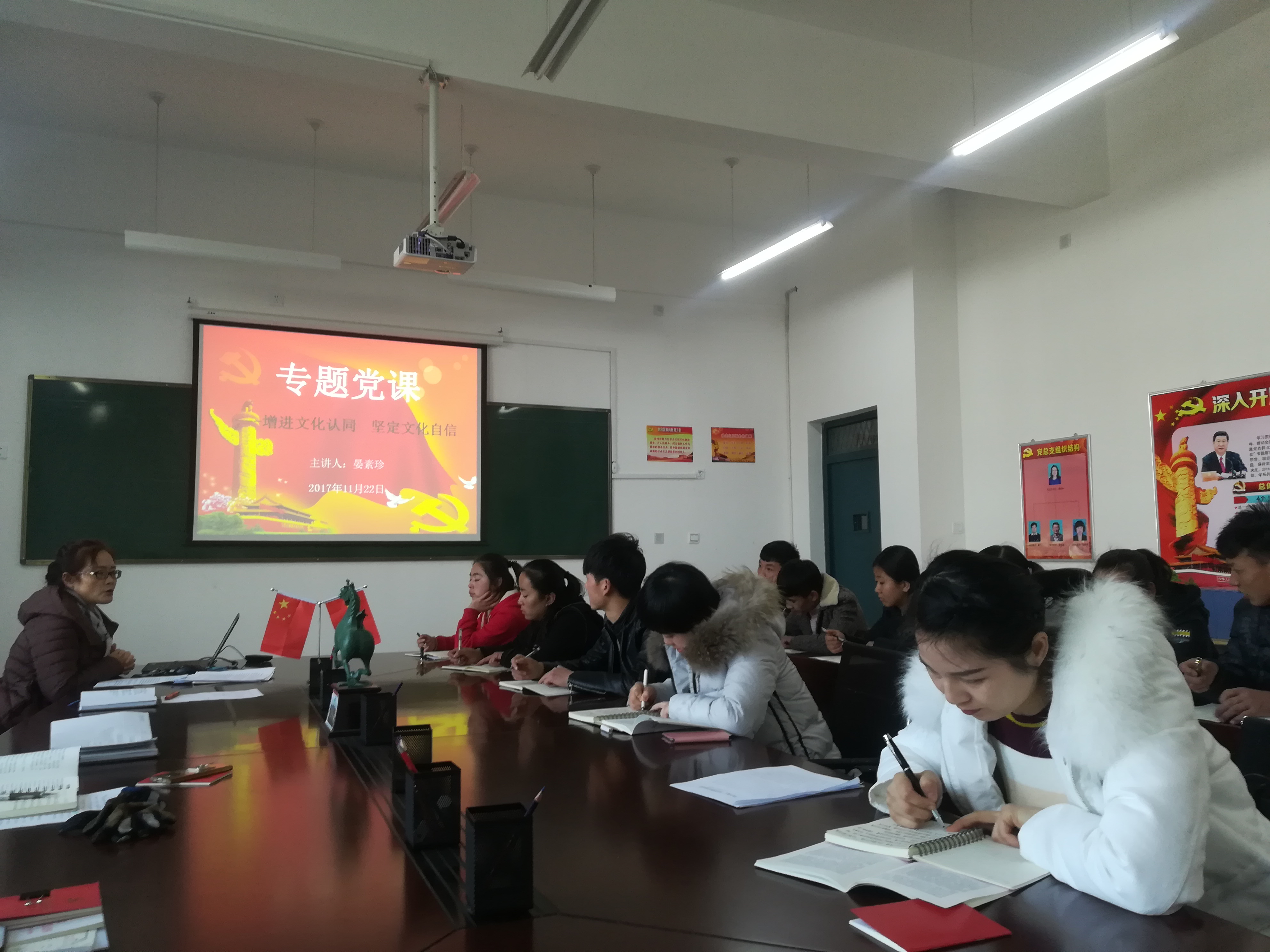 黨課以《增進文化認同 堅定文化自信》為主題,主要從文化認同是文化自信的基礎(chǔ)和源泉、文化認同與文化自信具有價值追求一致性兩個方面進行了講解。