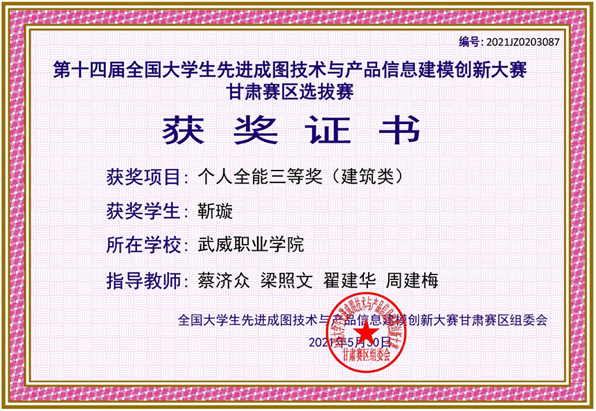第十四屆全國(guó)大學(xué)生先進(jìn)成圖技術(shù)與產(chǎn)品信息建模創(chuàng)新大賽甘肅賽區(qū)選拔賽獲個(gè)人全能三等獎(jiǎng)(建筑類(lèi))