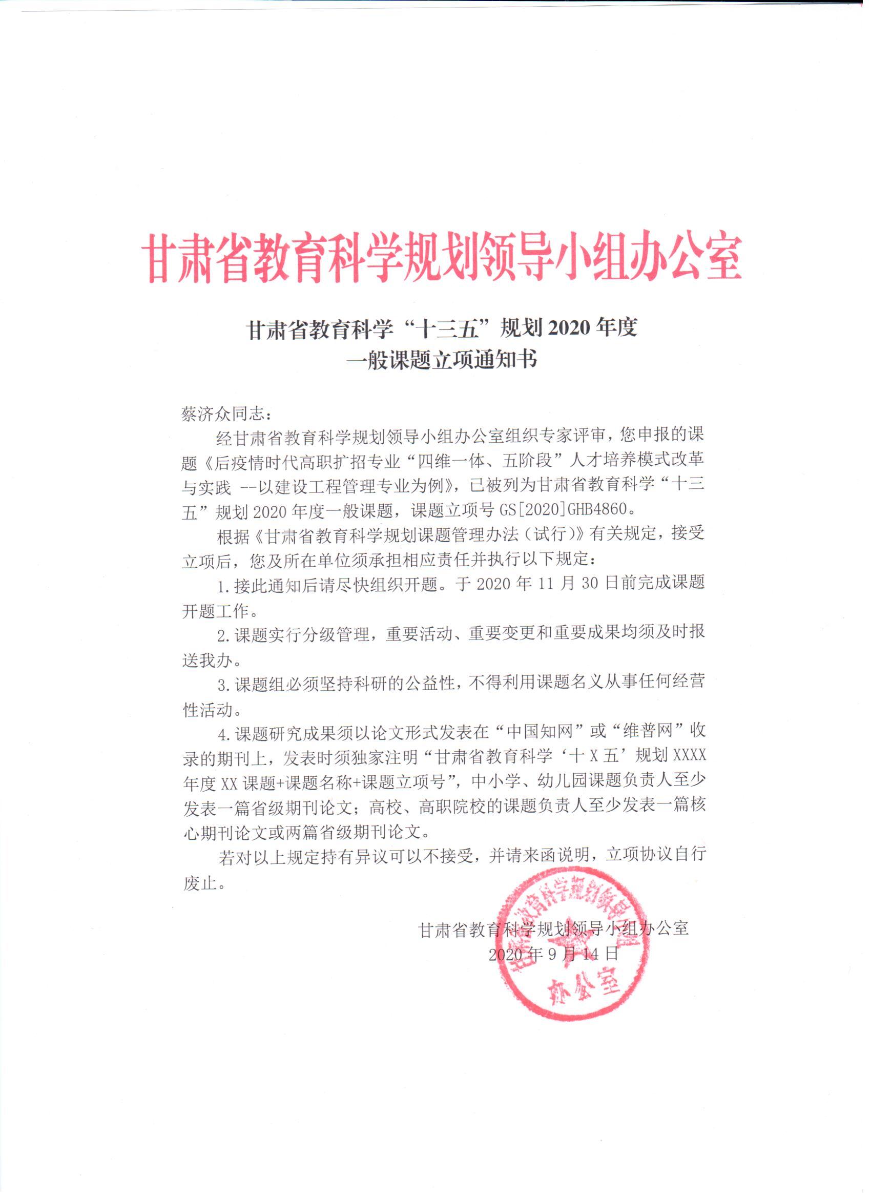 1.2020年項(xiàng)目組成員蔡濟(jì)眾、康興奎申報(bào)甘肅省“十三五”教育規(guī)劃課題《后疫情時(shí)代高職擴(kuò)招專業(yè)“四維一體、五階段”人才培養(yǎng)改革與實(shí)踐-以建設(shè)工程管理專業(yè)為例》 立項(xiàng) 【立項(xiàng)通知書】