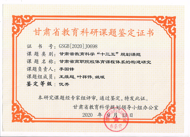 6.2020年項(xiàng)目組成員李國鋒完成甘肅省教育科學(xué)“十三五”規(guī)劃課題《甘肅省高職院校體育課程體系的構(gòu)建研究》已結(jié)項(xiàng)獲優(yōu)秀獎(jiǎng) 【鑒定證書】