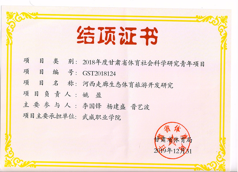 8.2019年項(xiàng)目組成員李國鋒參與完成甘肅省體育社會(huì)科學(xué)研究青年項(xiàng)目《河西走廊生態(tài)體育旅游開發(fā)研究》已結(jié)項(xiàng) 【結(jié)項(xiàng)證書】