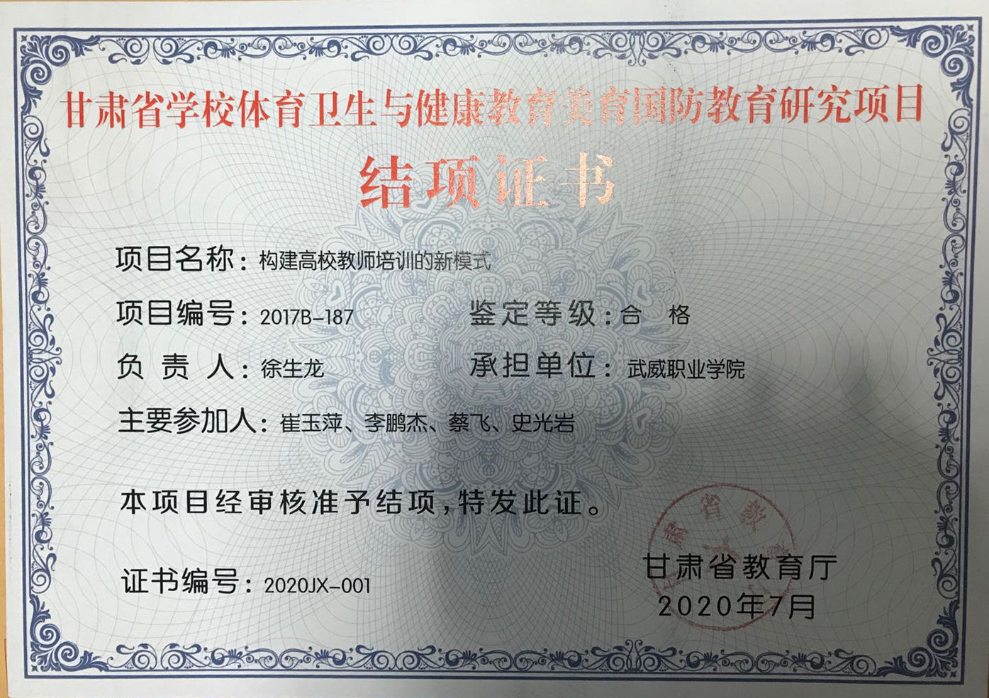 9.2020年項(xiàng)目組成員徐生龍主持完成甘肅省學(xué)校體育衛(wèi)生與健康教育美育國防教育研究項(xiàng)目《構(gòu)建高校教師培訓(xùn)的新模式》 結(jié)項(xiàng) 【結(jié)項(xiàng)證書】