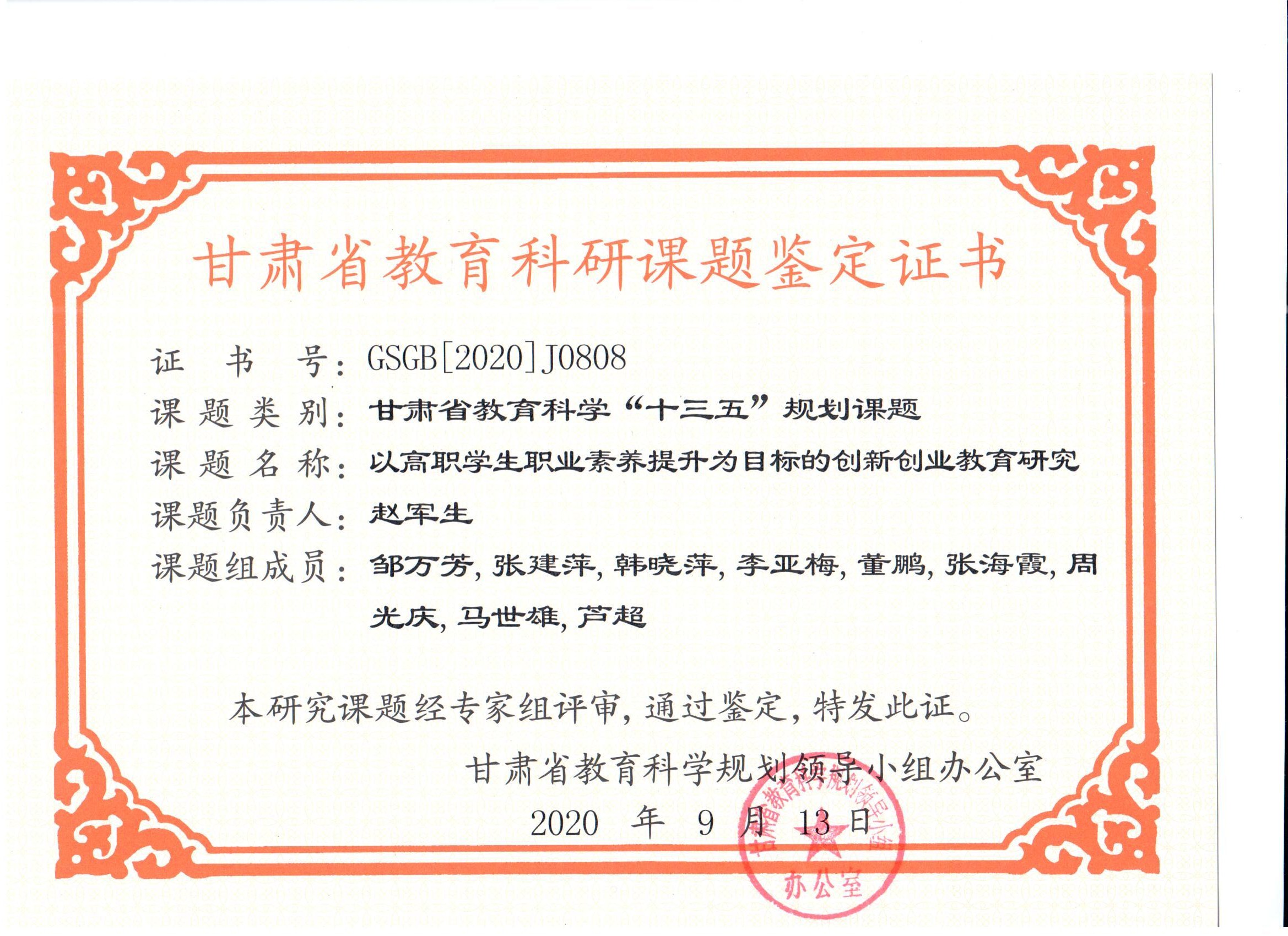 13.2020年項(xiàng)目組成員董鵬完成甘肅省教育科學(xué)“十三五”規(guī)劃課題《以高職學(xué)生職業(yè)素養(yǎng)提升為目標(biāo)的創(chuàng)新創(chuàng)業(yè)教育研究》 結(jié)項(xiàng) 【鑒定證書】