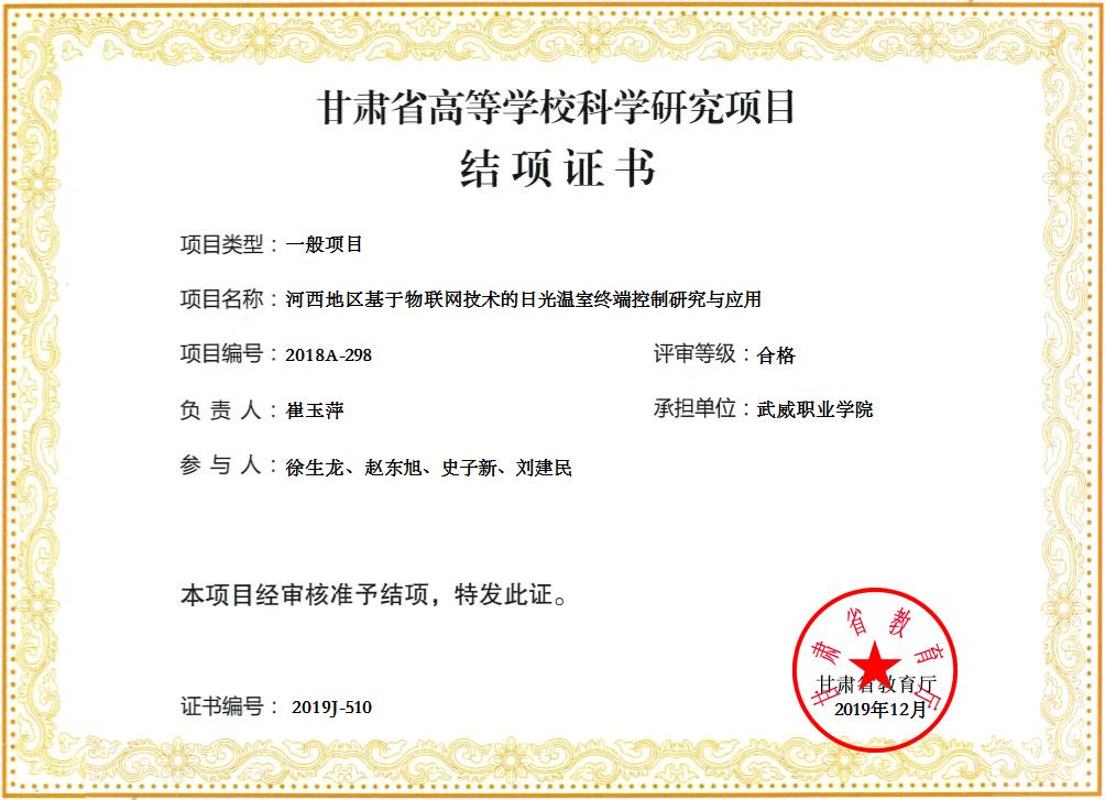 19.2019年項(xiàng)目組成員崔玉萍主持完成甘肅省高等學(xué)??茖W(xué)研究項(xiàng)目《河西地區(qū)基于物聯(lián)網(wǎng)技術(shù)的日光溫室終端控制研究與應(yīng)用》 結(jié)項(xiàng) 【結(jié)項(xiàng)證書】