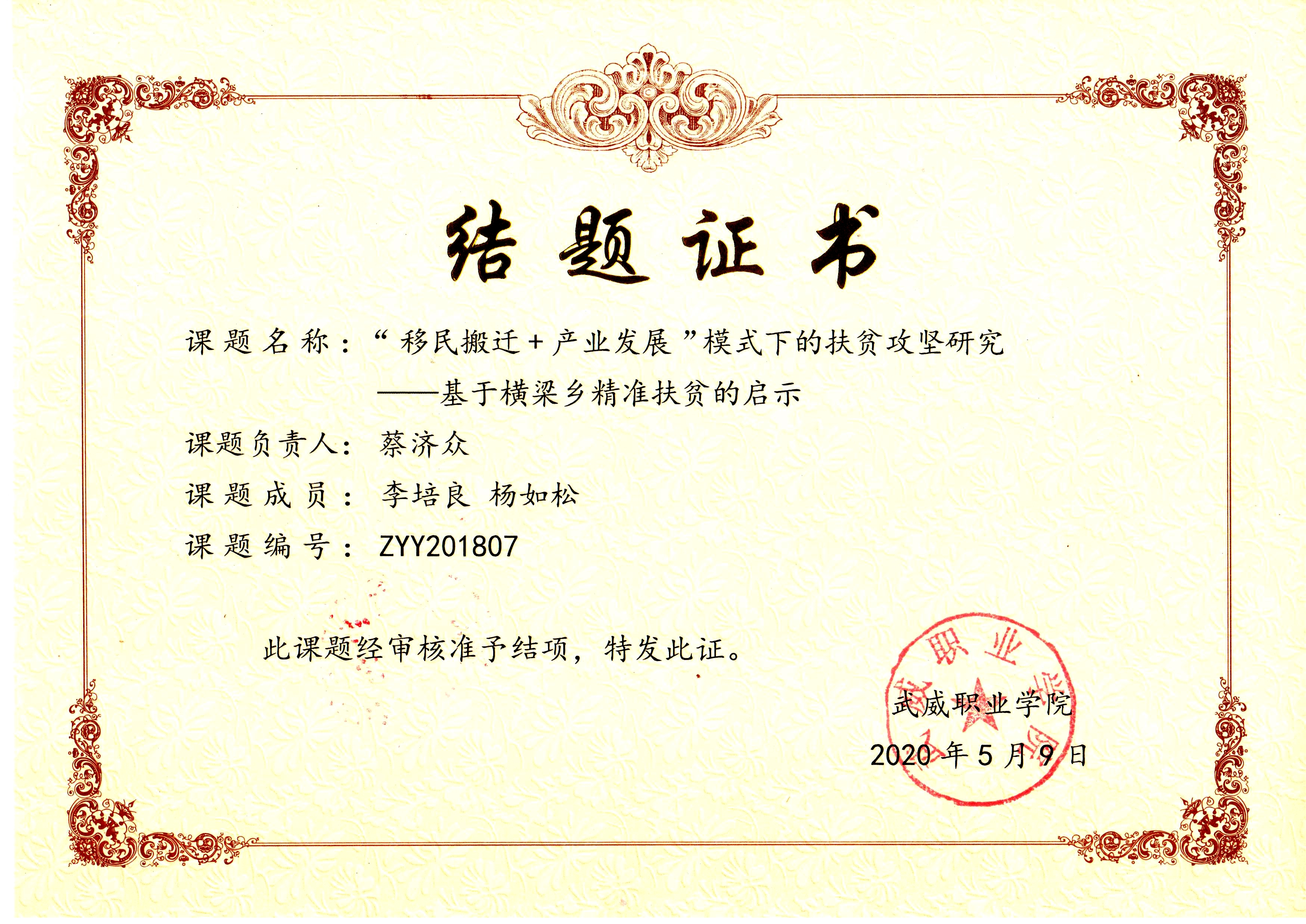 25.2020年項(xiàng)目組成員蔡濟(jì)眾主持完成院級科研項(xiàng)目《“移民搬遷+產(chǎn)業(yè)發(fā)展”模式下的扶貧攻堅(jiān)研究--基于橫梁鄉(xiāng)精準(zhǔn)扶貧的啟示》 結(jié)項(xiàng) 【結(jié)題證書】